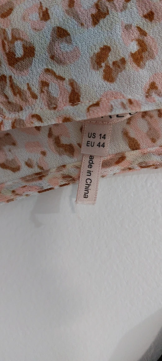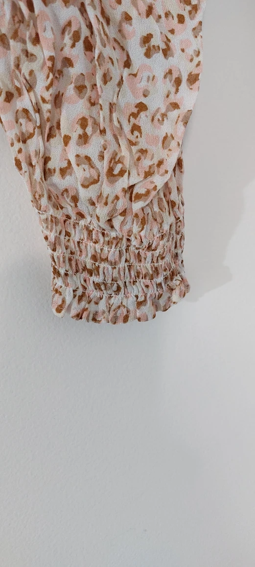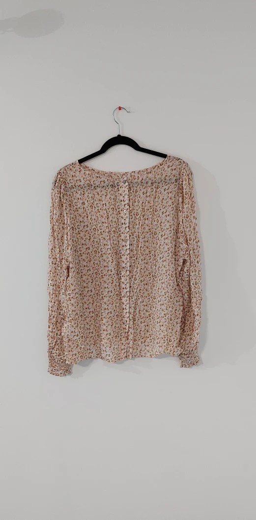 Here's a cute leopard print blouse in a size 14! It has long sleeves with a smocked detail at the wrists. Perfect for dressing up or down!