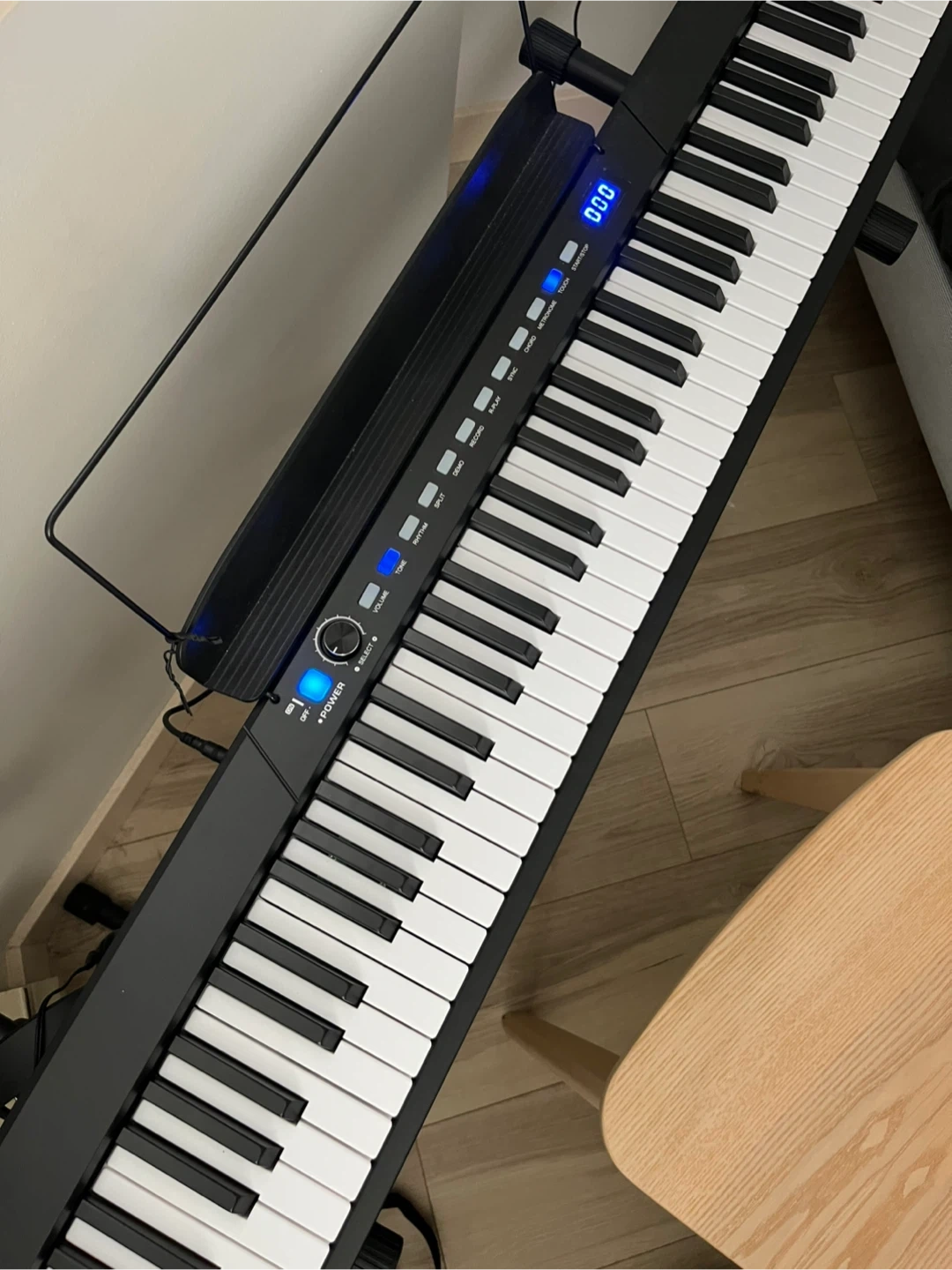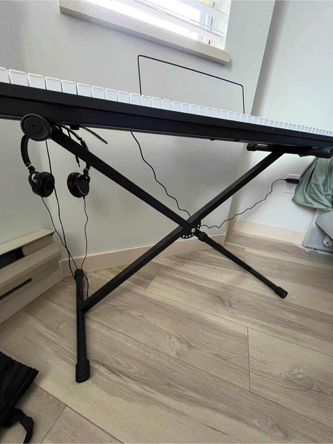 This is a portable electronic keyboard, perfect for beginners or for practicing on the go. It comes with a sturdy stand and a pair of headphones for private practice sessions. The keyboard has various functions and buttons for different tones and rhythms. It's great for learning or casual playing!