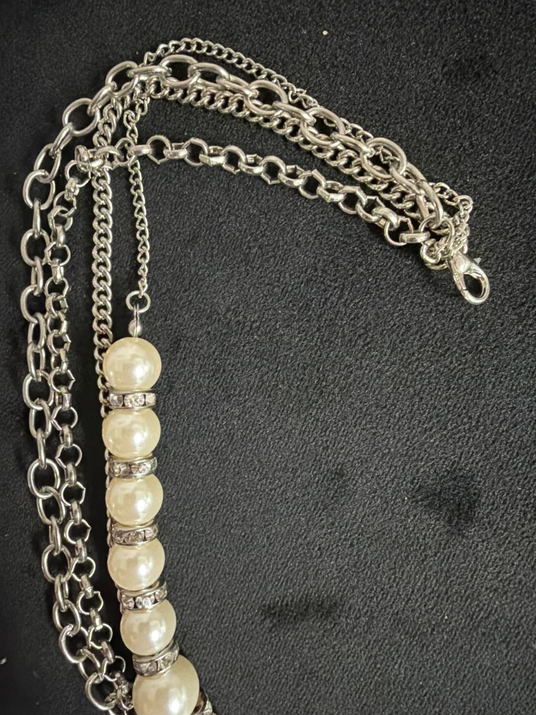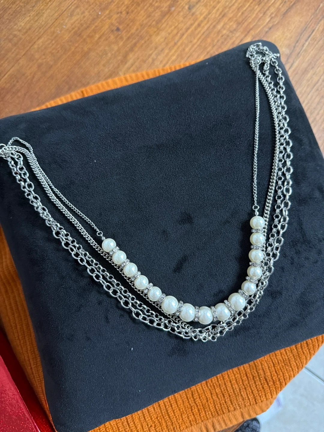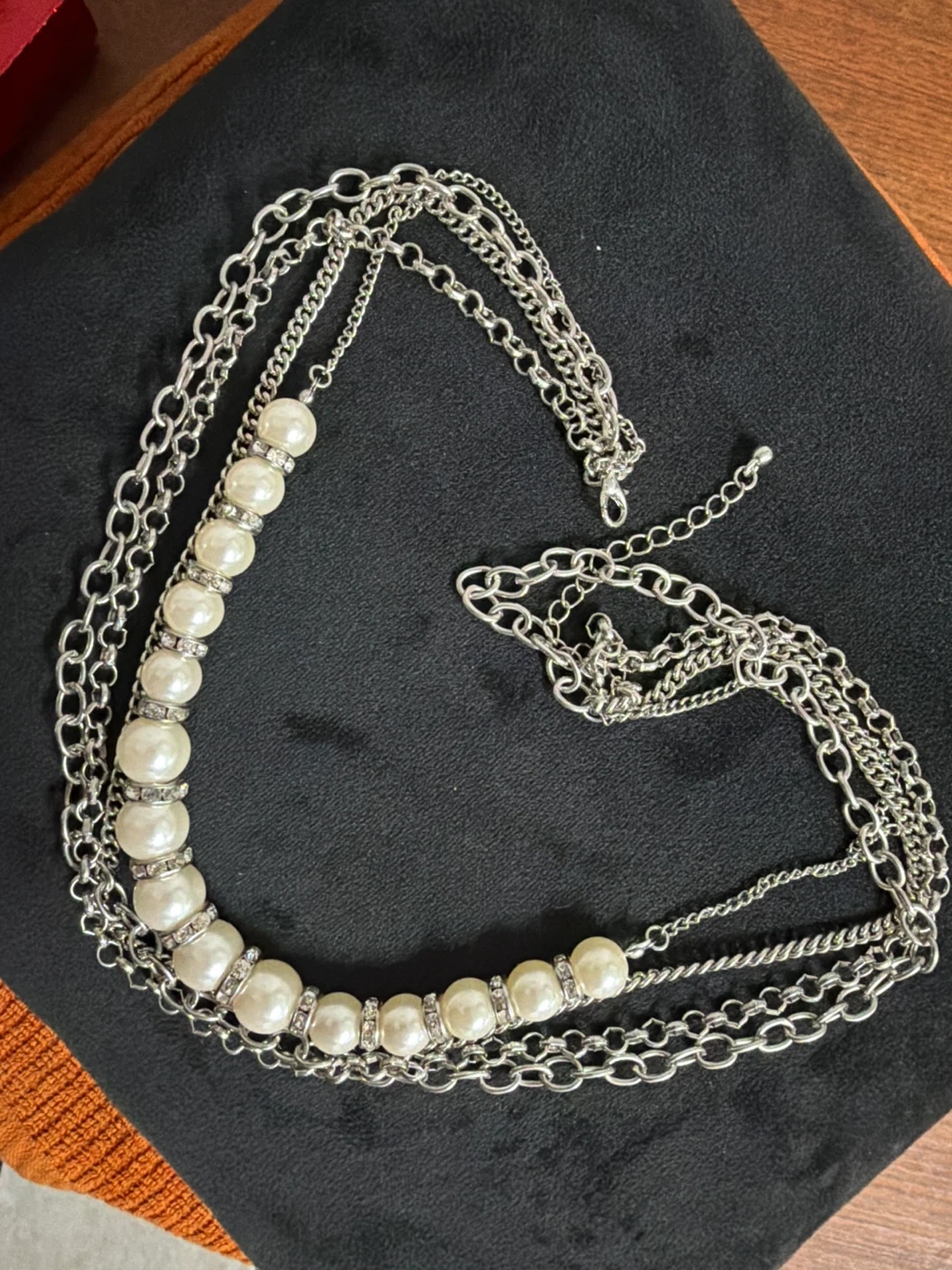 This necklace features multiple silver-tone chains layered with faux pearls and sparkling accents. It comes in a red gift box, ready for gifting or keeping. Its elegant design adds a touch of glamour to any outfit!