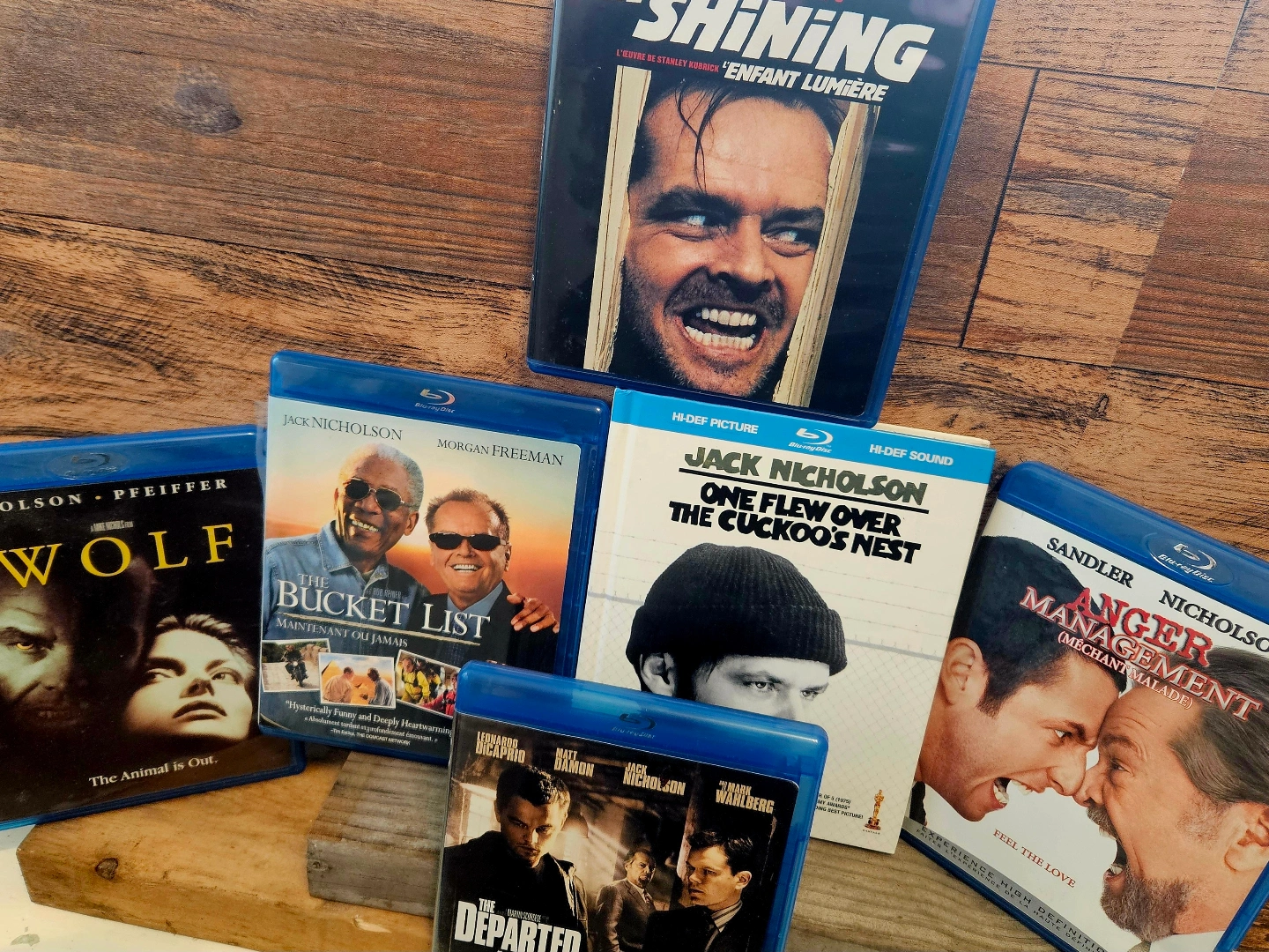 Collection of six Blu-ray movies. Titles include: The Shining, One Flew Over the Cuckoo's Nest, The Bucket List, Anger Management, The Departed and Wolf. Various actors including Jack Nicholson, Morgan Freeman, and Adam Sandler.