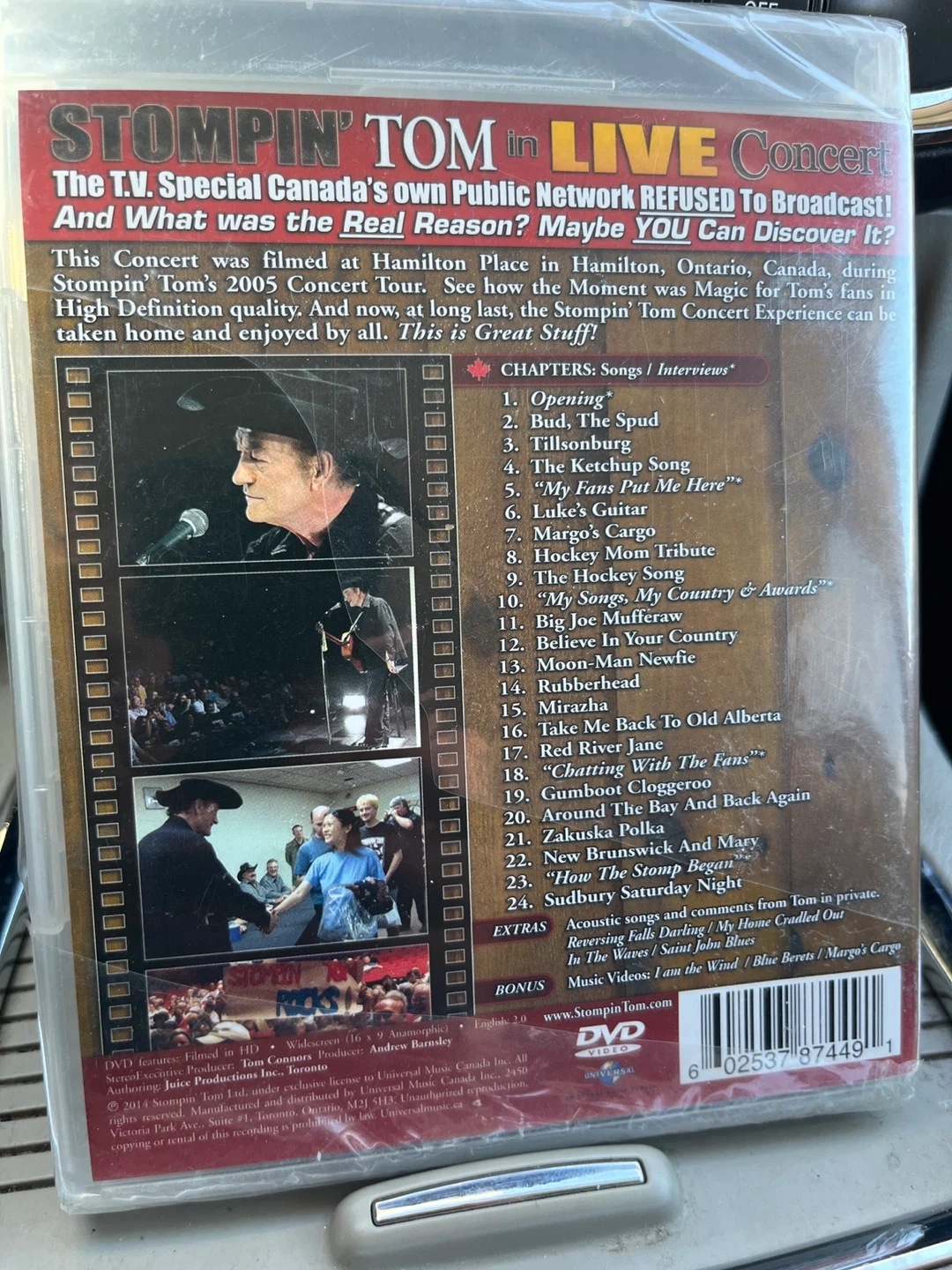 This DVD captures Stompin' Tom's 2005 concert tour performance at Hamilton Place. It includes chapters, songs, and interviews. The disc is in very good condition and features a variety of his popular hits.