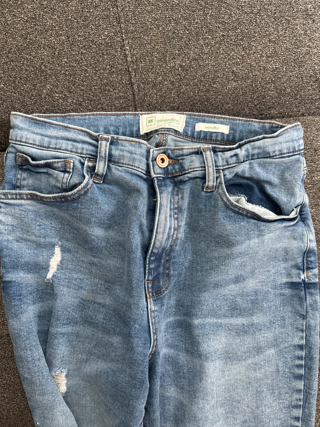 Selling a pair of RE Generation Mindful jeans. They are a size 5/27 and made of 98% cotton. They have a light wash and some distressed detailing.