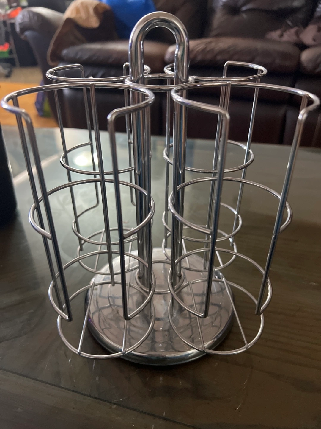 Chrome-plated metal mug tree. Holds approximately 12 mugs. Rotating design. Great for organizing your coffee cups.
