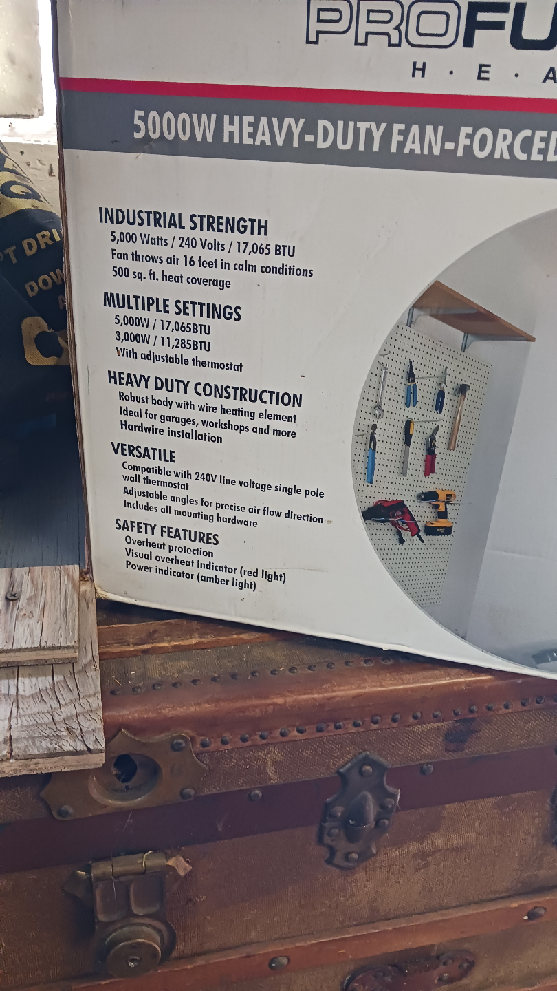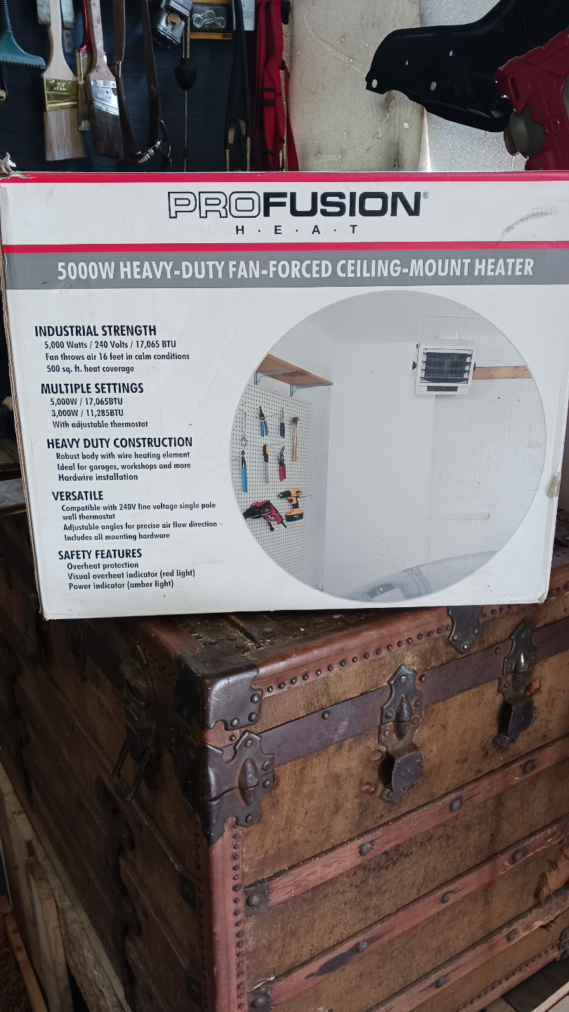 Fan-forced ceiling-mount heater. Includes overheat protection safety shut-off device. Adjustable louvres and thermostat. Consider this perfect for your garage to create a comfortable work environment.