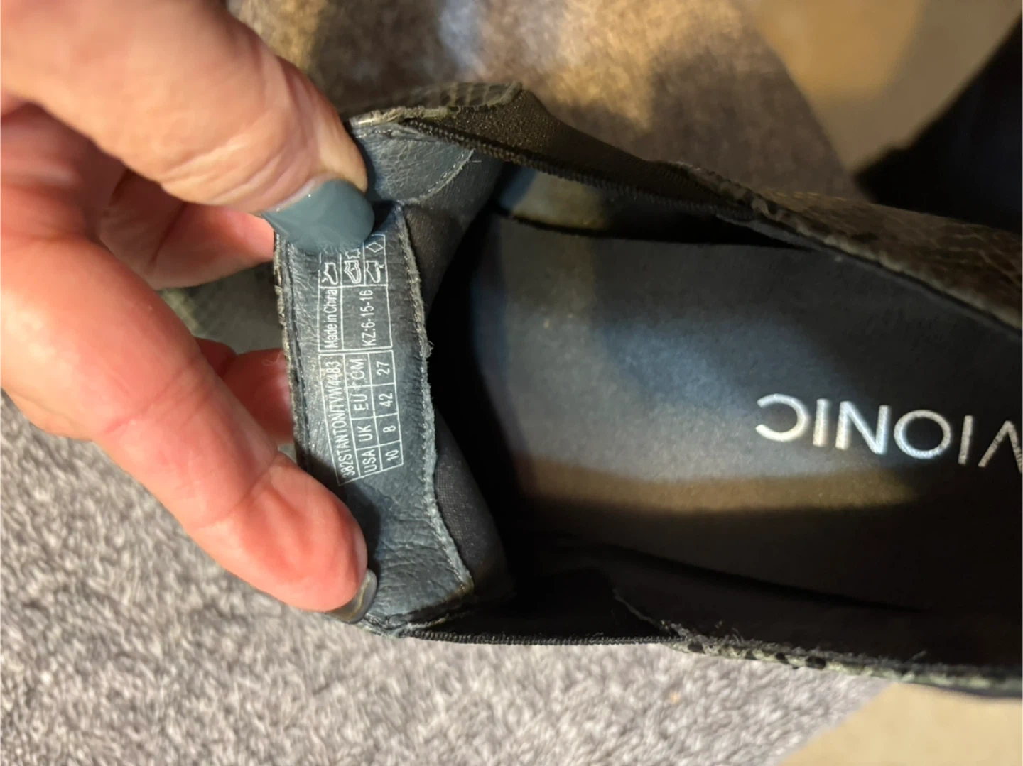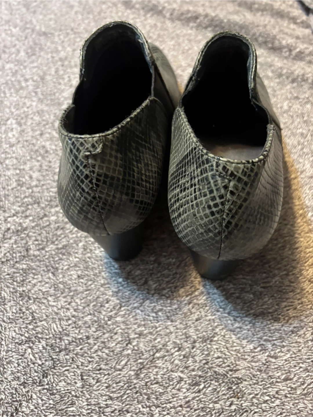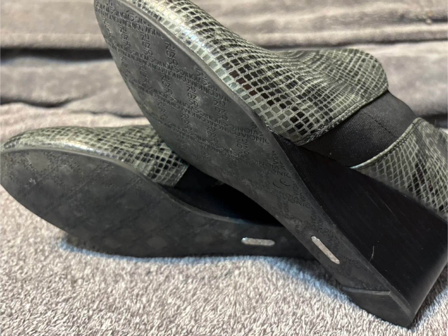 Comfortable Vionic slip-on boots featuring a grey snake print design. These boots have elastic side panels for easy wear. They're great for adding a stylish touch to any casual outfit. Like new