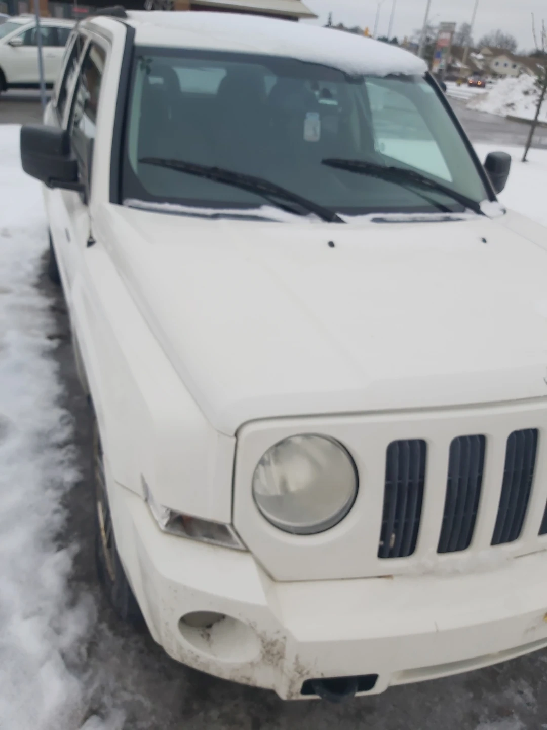A white Jeep Patriot with 4x4 capability. It features a functional interior with automatic transmission 4x4 218 km heat seat location mississauga as is good brakes and snow tires