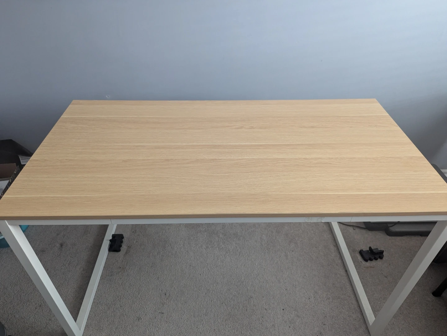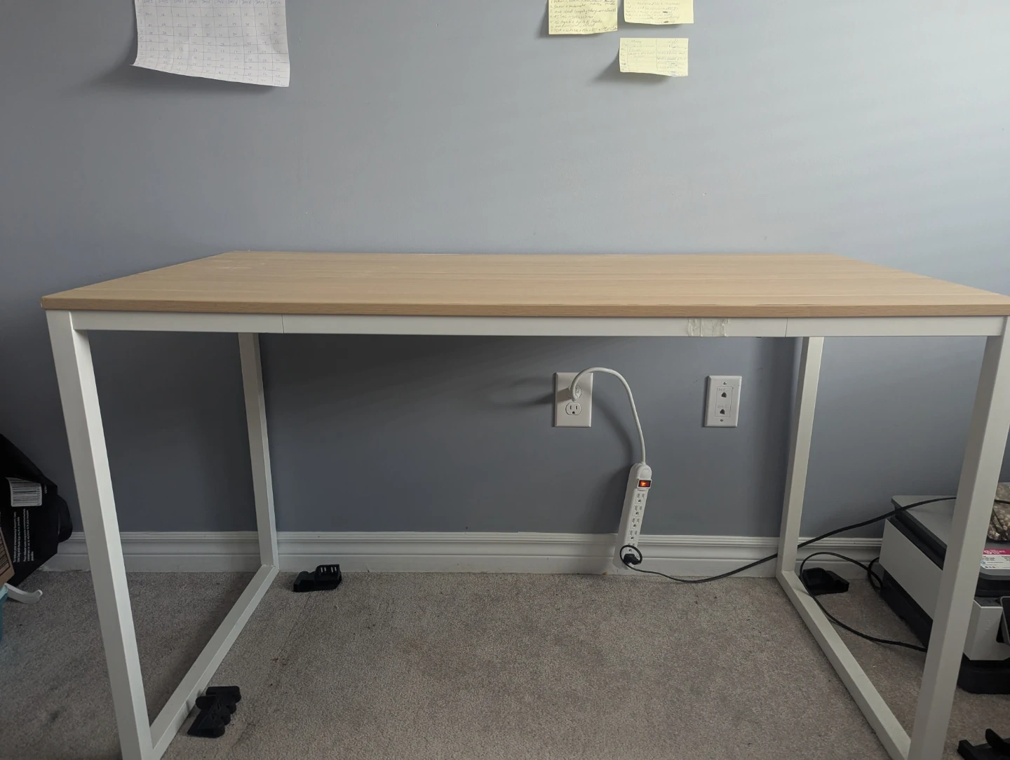 This simple desk features a light wood grain top with white metal legs. It's a straightforward piece that provides a good workspace. The desk is made of particleboard and metal.
