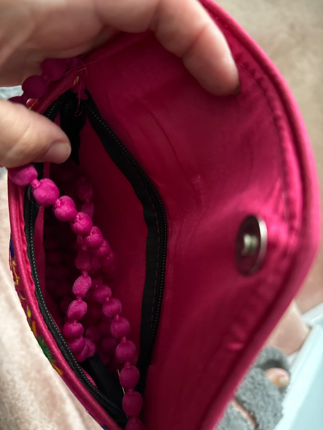 Cute embroidered clutch purse with a colourful floral design! It's in great condition and perfect for adding a pop of colour to any outfit. The inside is a bright pink colour with a small zippered pocket. It's a great size for carrying your essentials