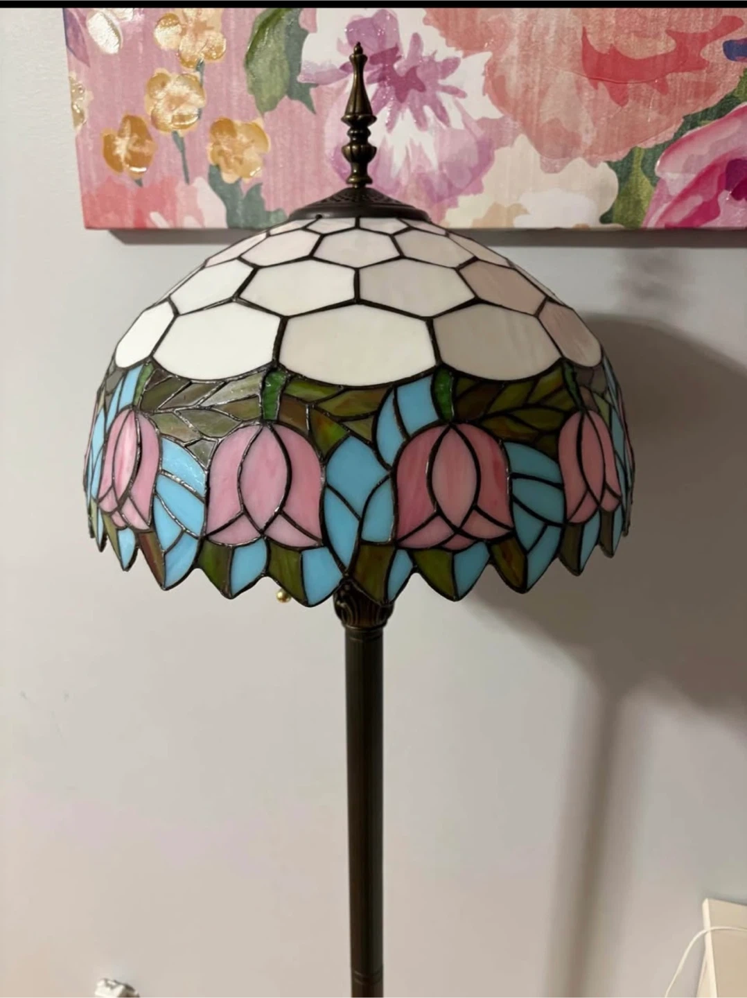 This is a beautiful stained glass tulip floor lamp. 16” lamp shade 64” height .pkease bring cash pick up in st.albert.It would look great in any room!
