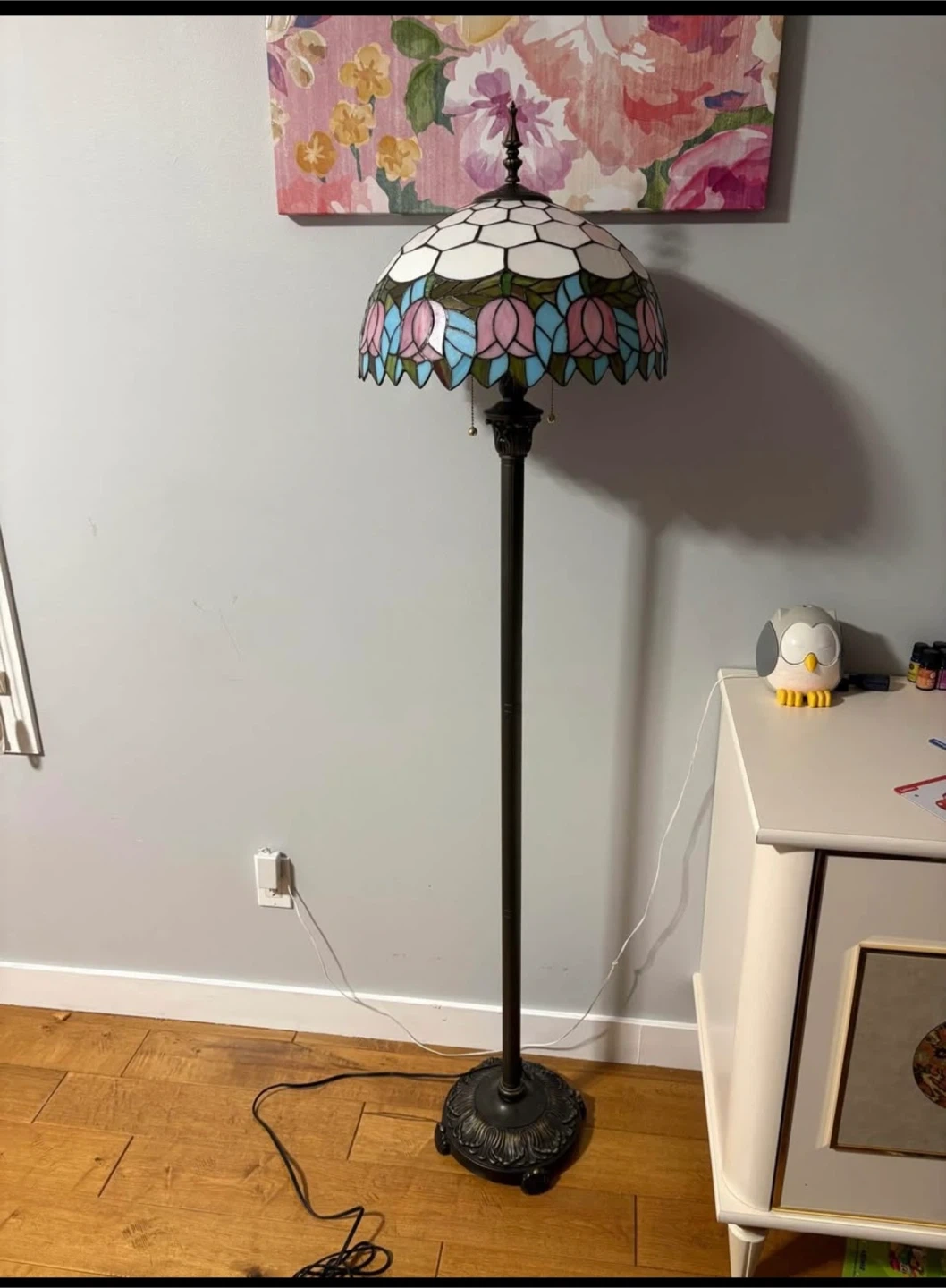 This is a beautiful stained glass tulip floor lamp. 16” lamp shade 64” height .pkease bring cash pick up in st.albert.It would look great in any room!