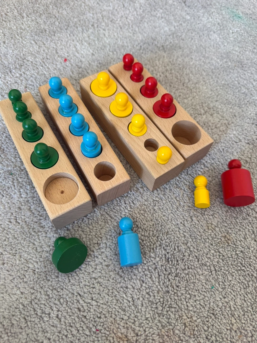 These wooden cylinder push down toys are great for developing fine motor skills. They come in a set of four blocks with various sized cylinders. Perfect for little hands to grasp and manipulate!