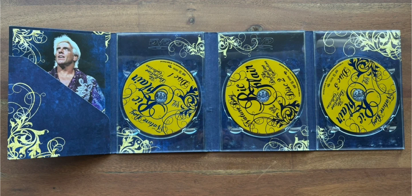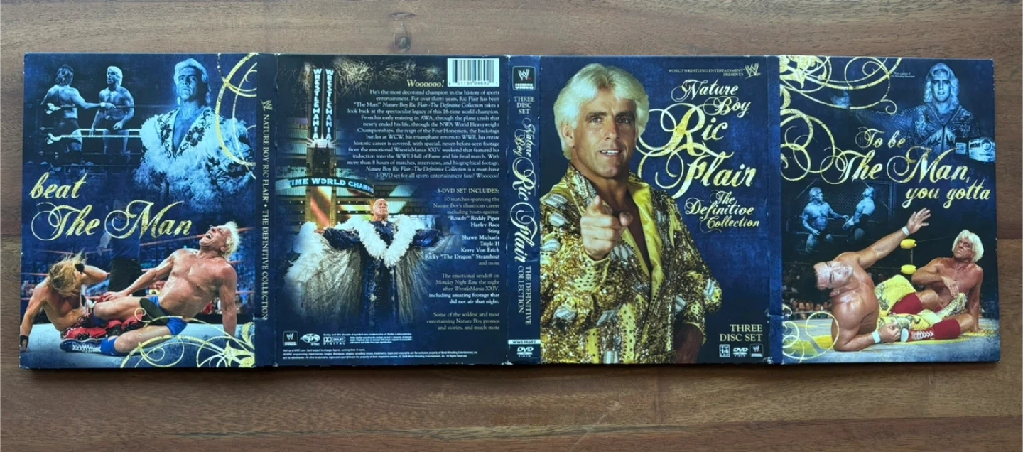 Selling the Nature Boy Ric Flair: The Definitive Collection DVD set! It's a three-disc set featuring the legendary wrestler Ric Flair. A must-have for any wrestling fan!