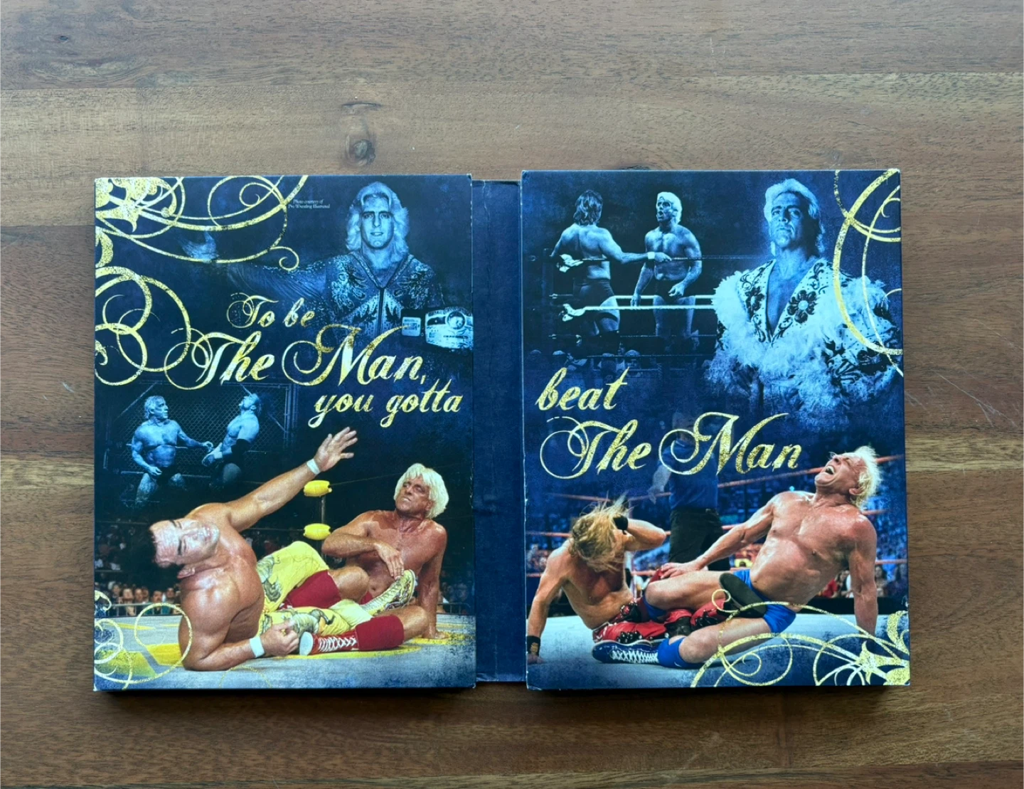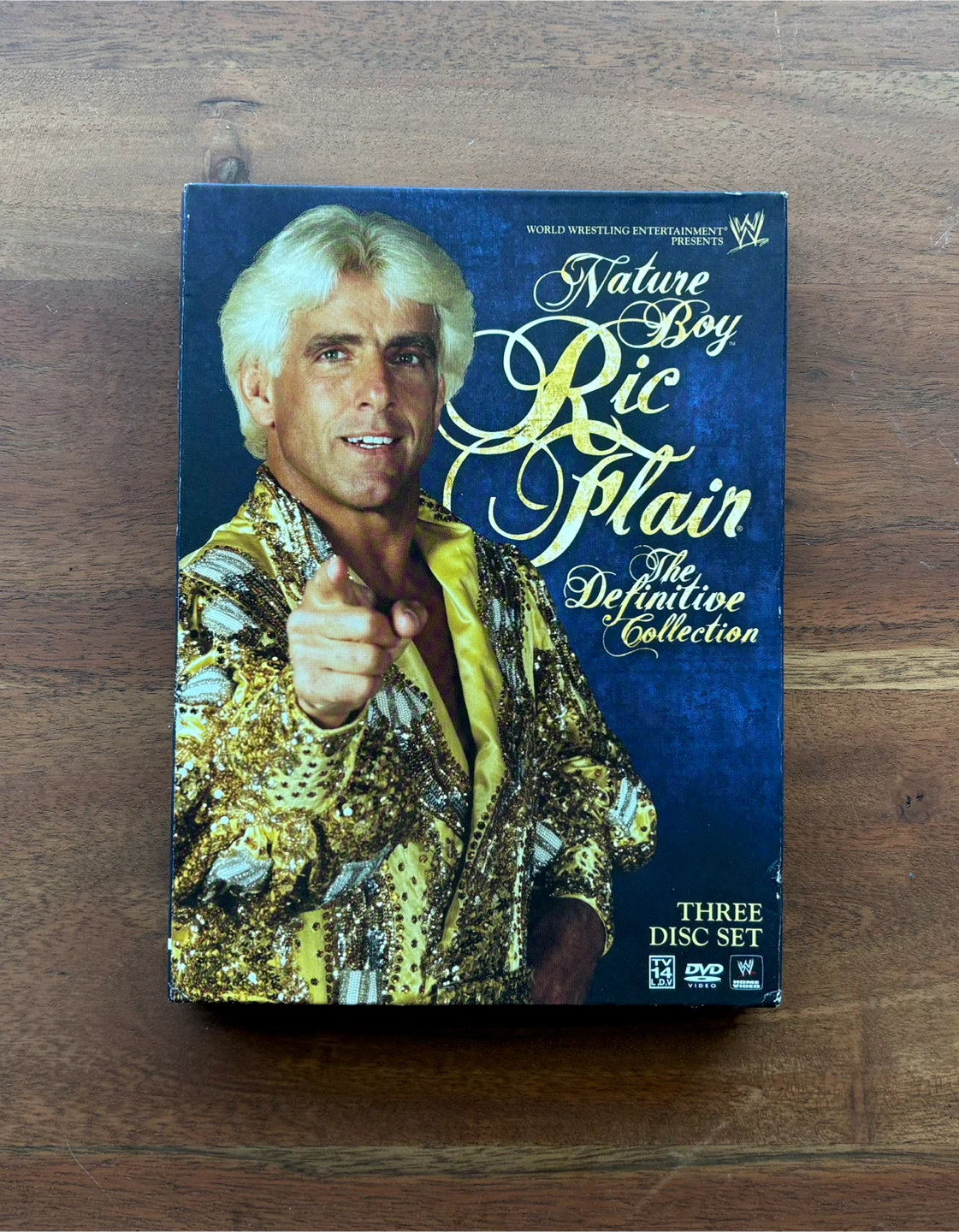 Selling the Nature Boy Ric Flair: The Definitive Collection DVD set! It's a three-disc set featuring the legendary wrestler Ric Flair. A must-have for any wrestling fan!