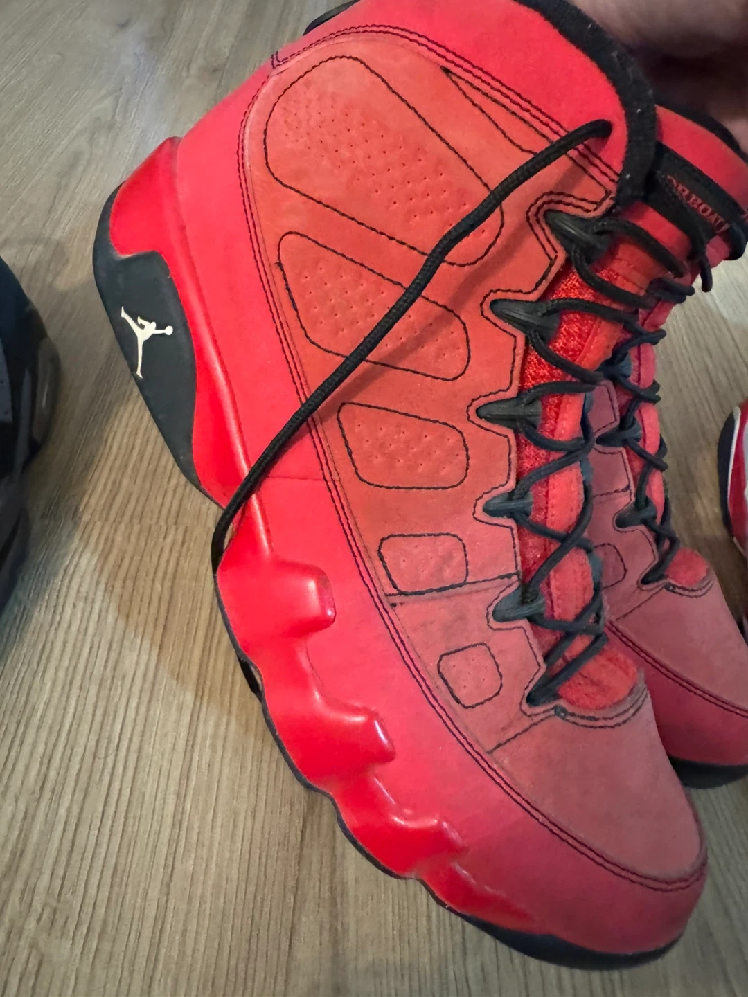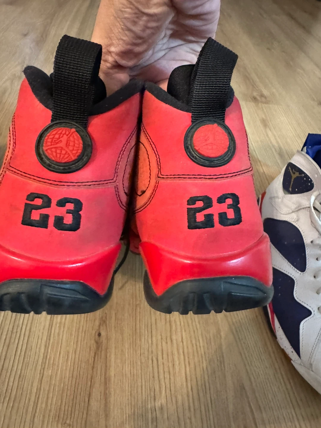 A collection of Air Jordan sneakers. Features the Air Jordan 7 VII "USA Olympic" and the Air Jordan 9 IX "motorboat jones” and the jordan 7 bourdeux” all in size 9 and authentic