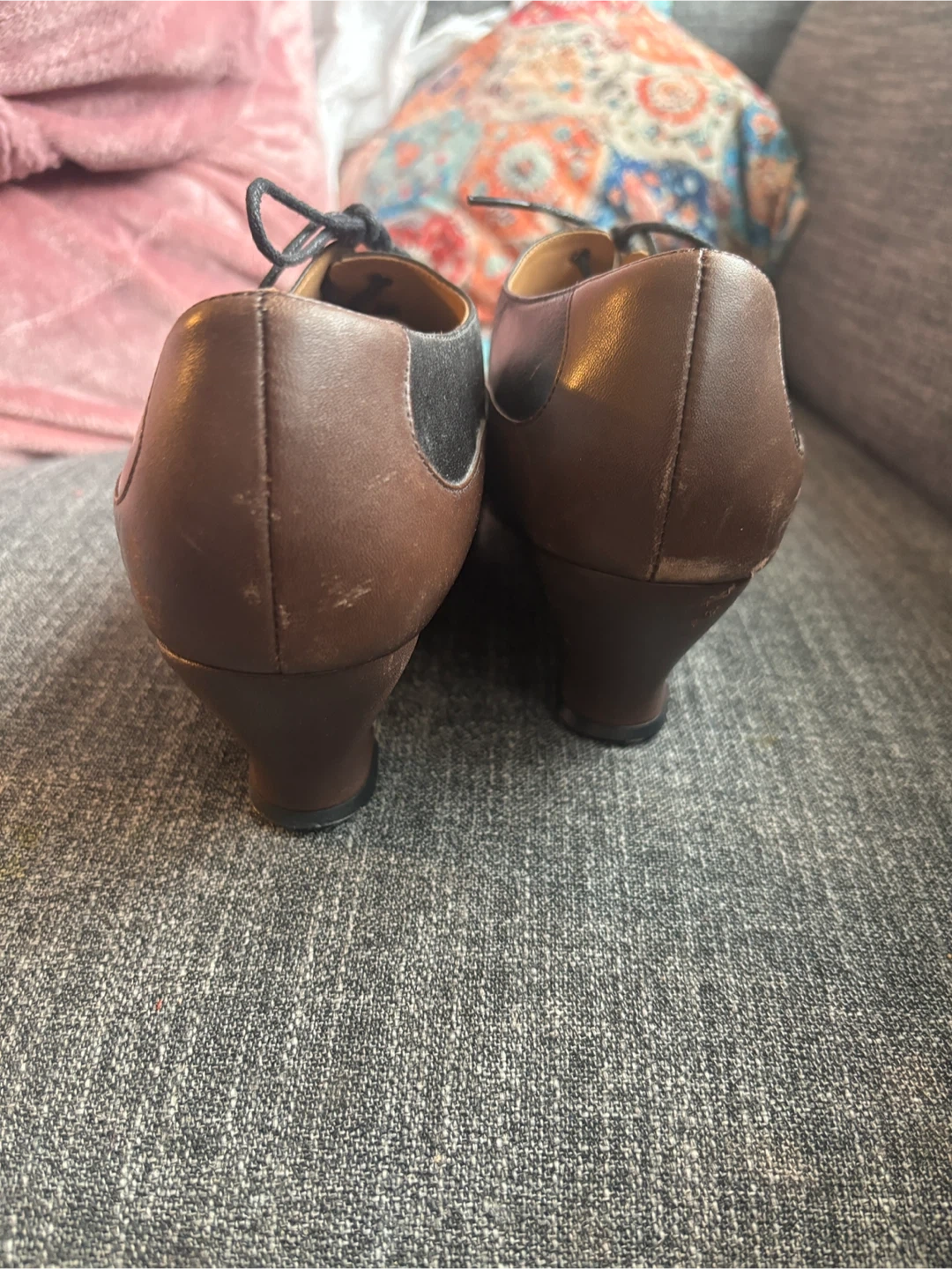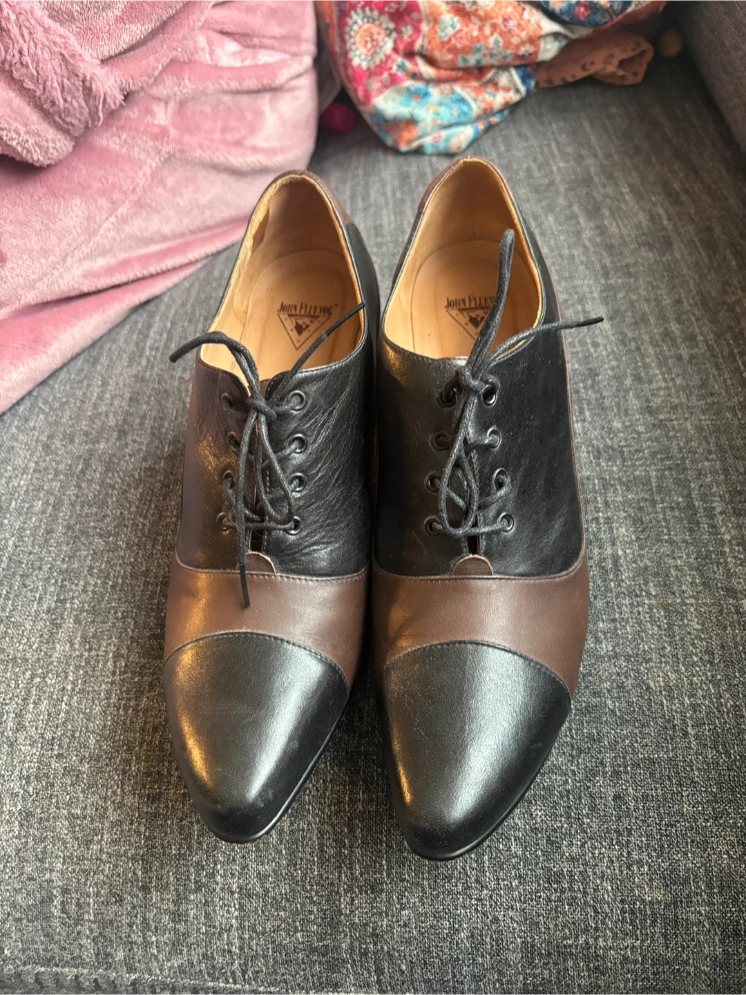 Brown and black leather lace-up oxford shoes from John Fluevog. Made in Peru. These shoes feature a classic oxford design with a comfortable heel.