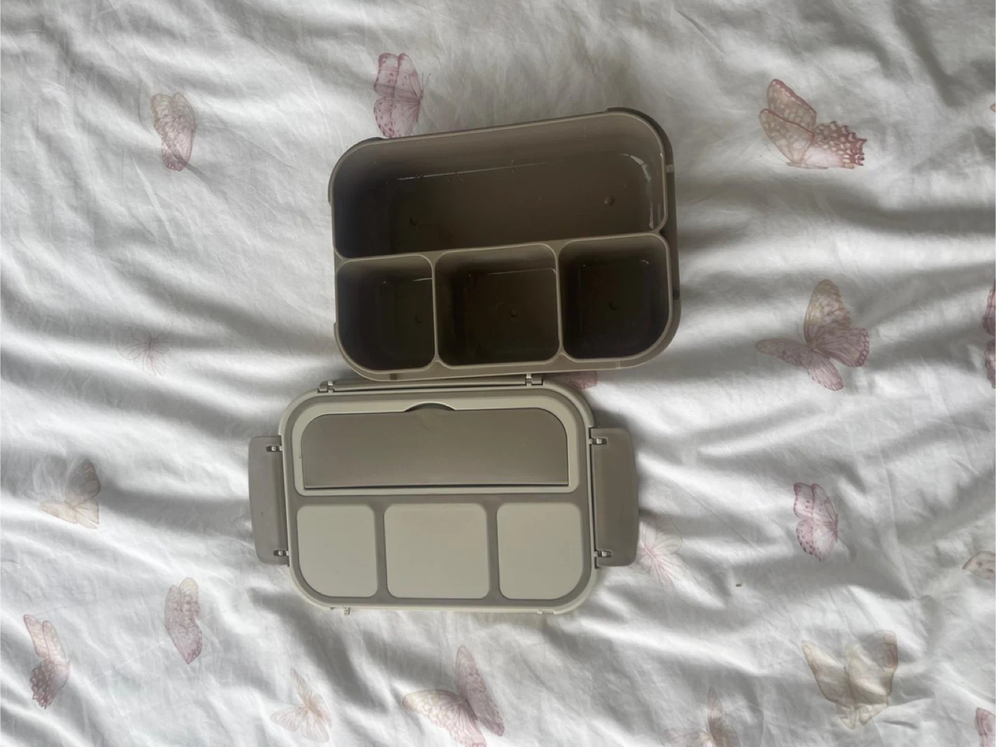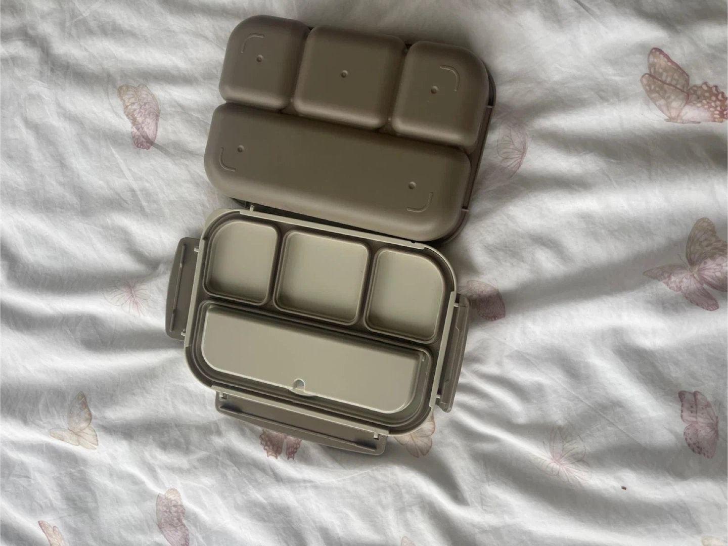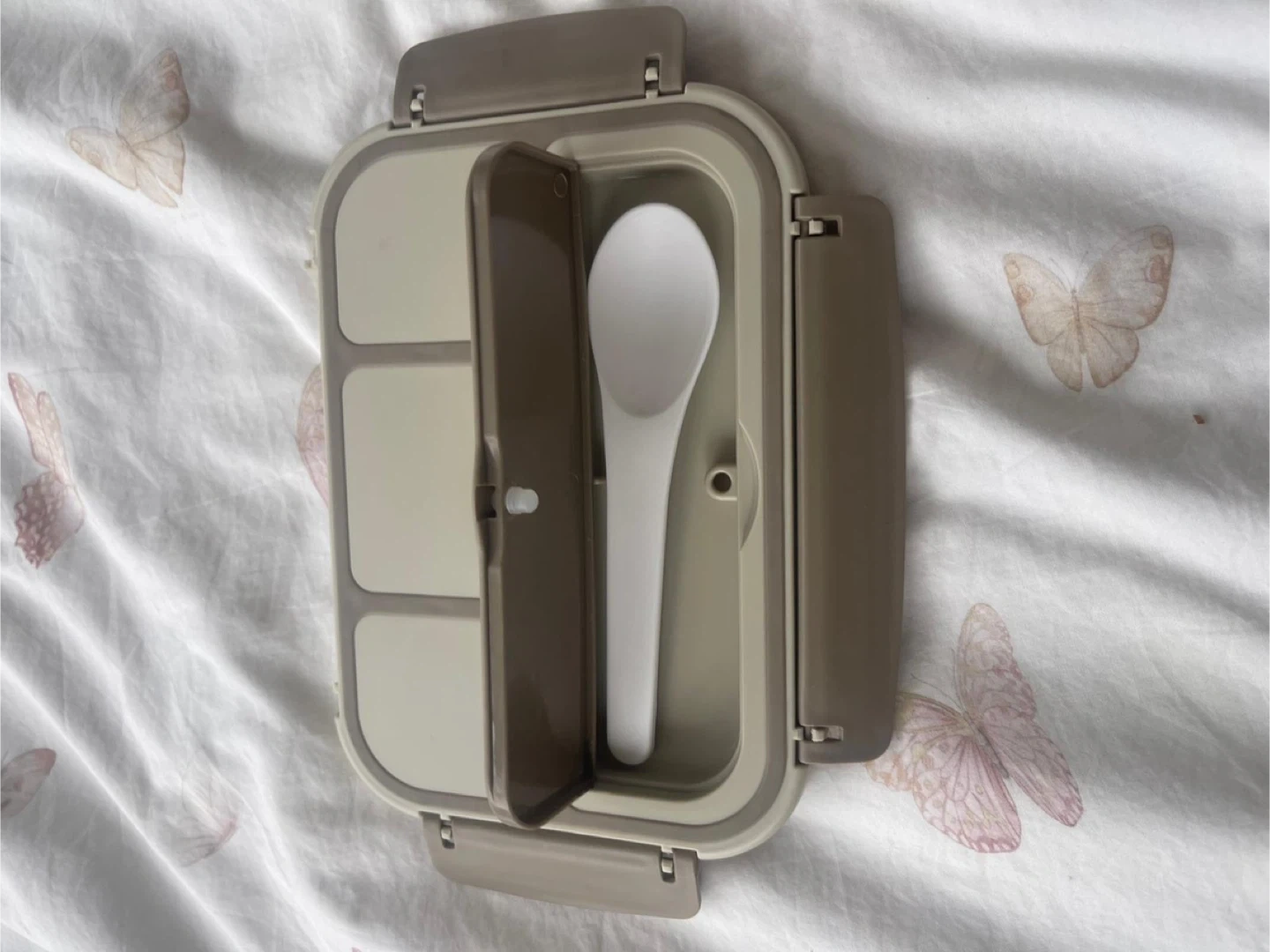 This bento lunch box has four compartments. It includes a spoon for your meals. BPA-free plastic construction.