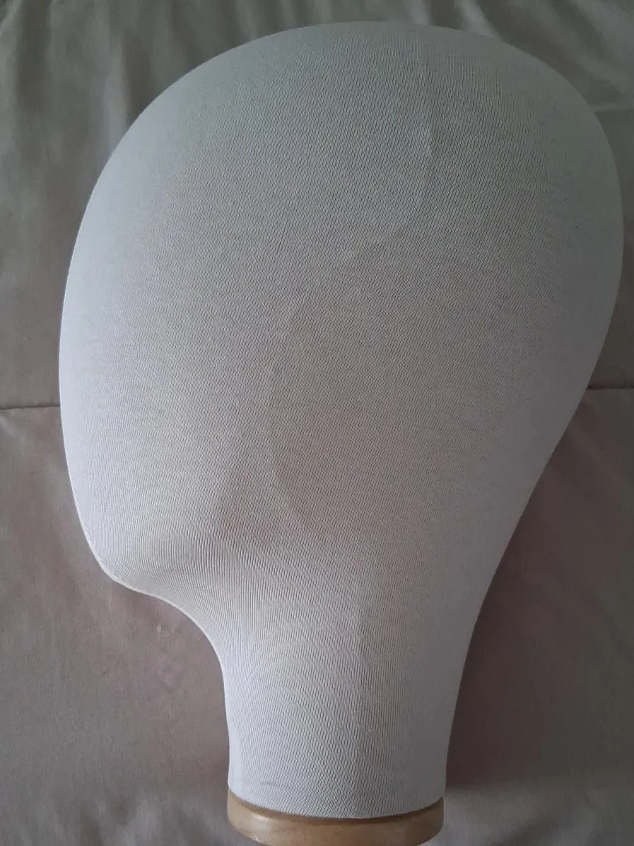 This is a fabric-covered standalone mannequin head for displaying wigs or hats. It's made of soft fabric with a wooden base, plastic head underneath fabric. This stand is handy for hairstylists or hat shops.