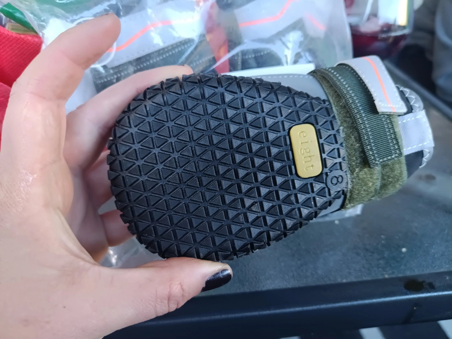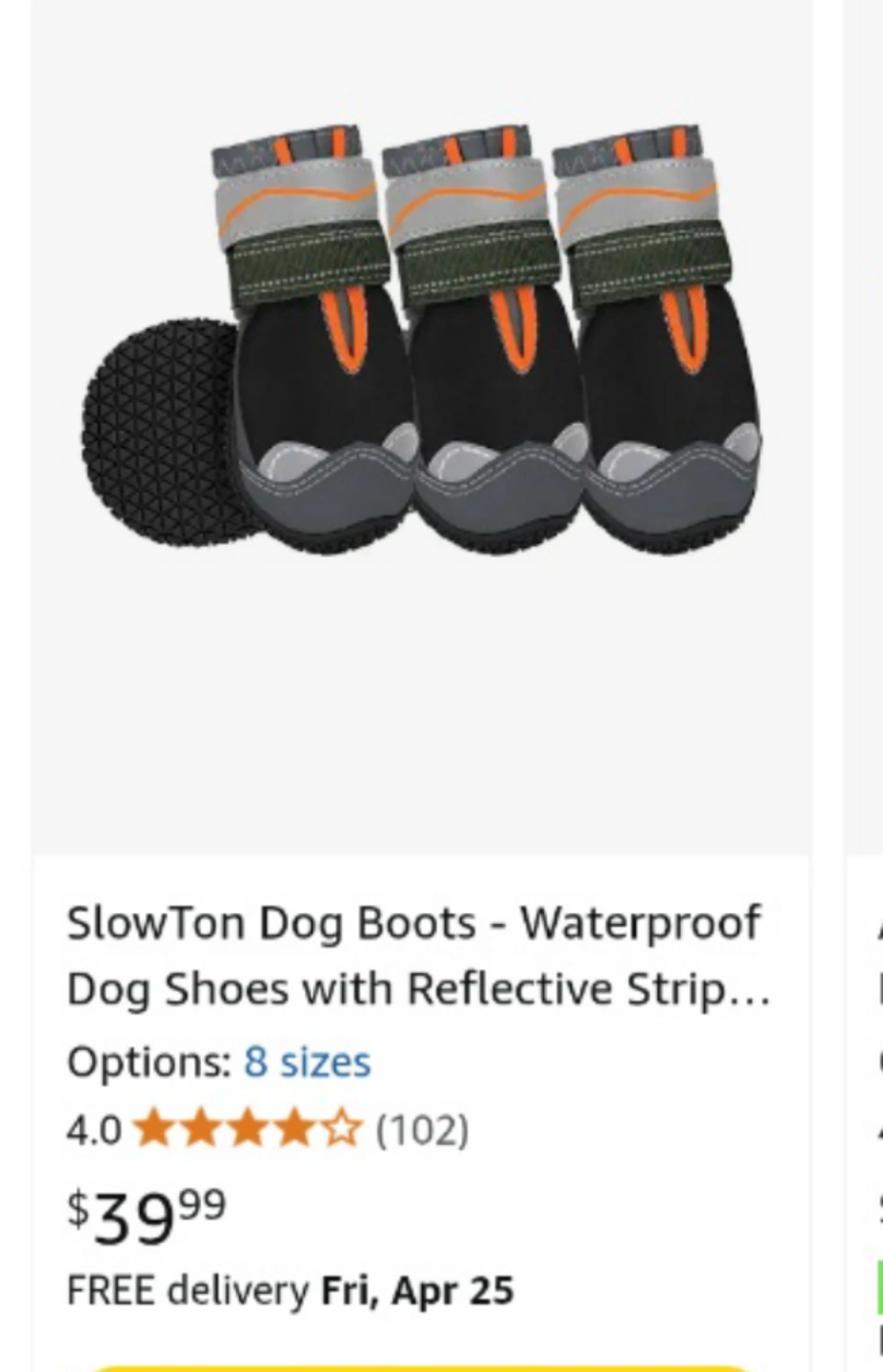 Set of waterproof dog boots. Size 8. Features reflective strip. Durable, non-slip sole. Great for protecting paws.