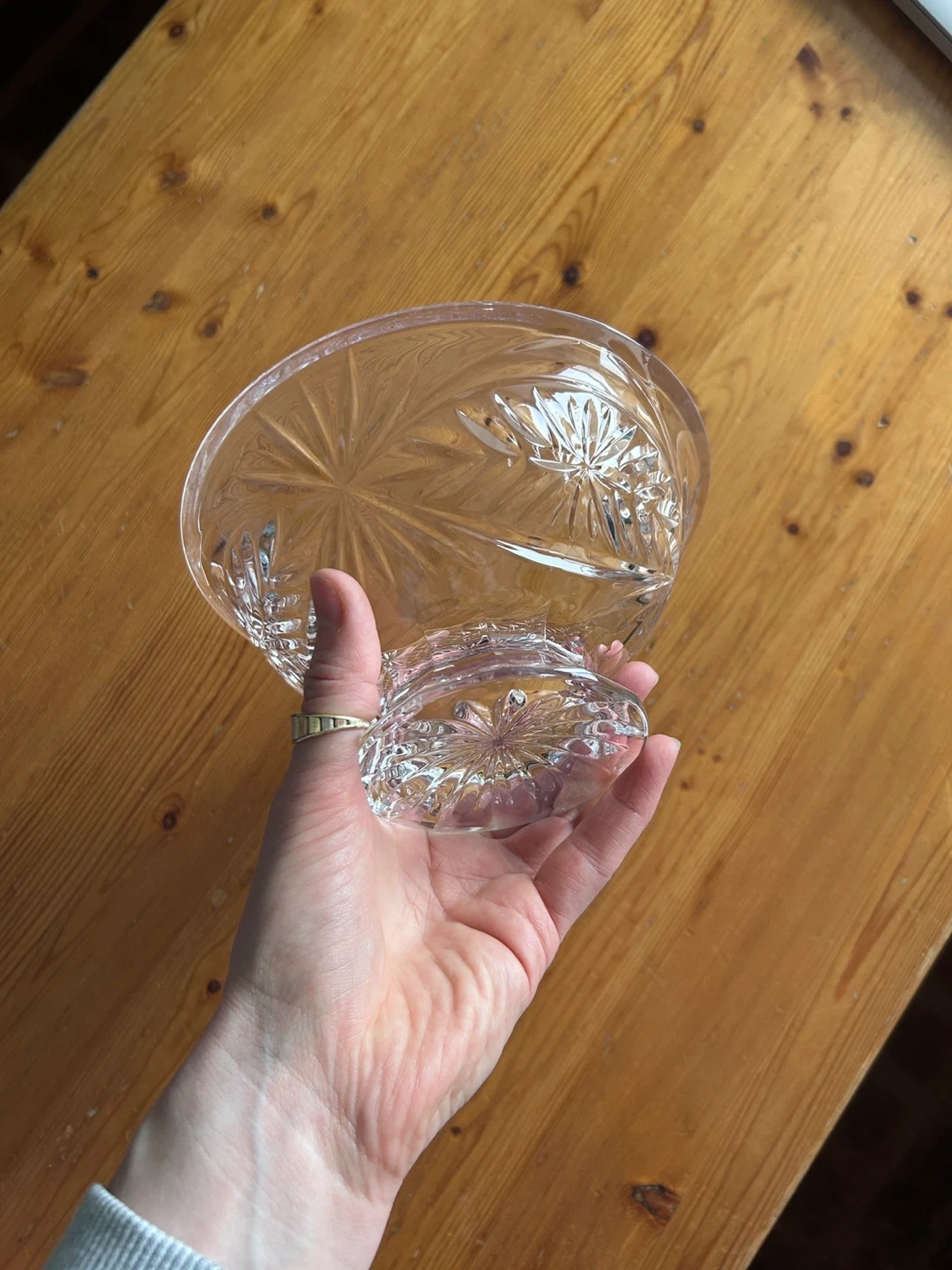 This is a beautiful crystal serving bowl. It features an ornate starburst pattern etched into the glass. Its elegant design makes it suitable for serving desserts or as a decorative centerpiece.