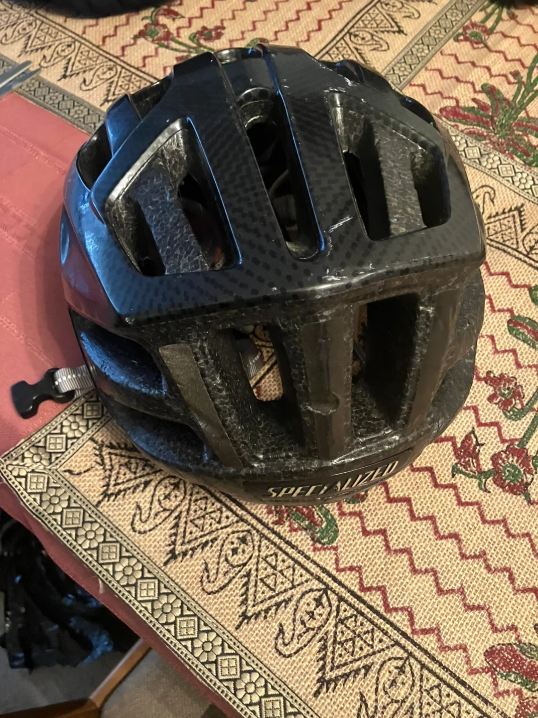 Selling a Specialized bike helmet in black. It's in good condition and ready for your next ride! There are some scratches on the surface.