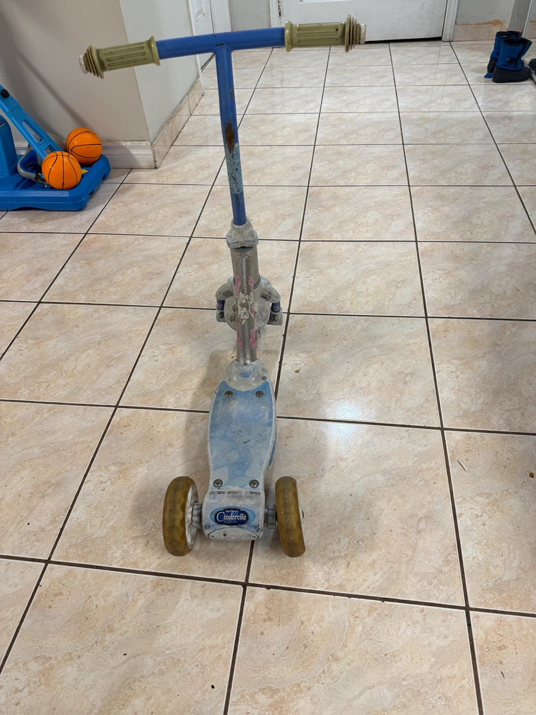 Selling a used Cinderella scooter. It has some wear and tear, but still lots of life left! Also including a box of kids clothes. Great for toddlers!