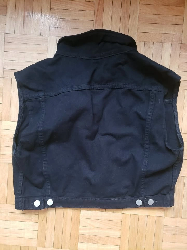 American Apparel black denim vest, size L. Features 5 silver button closure and two breast pockets with button closure. Worn a couple times, like new with no damage. Measurements: 16" Long, 19" Wide. Pick up near Queen and John.