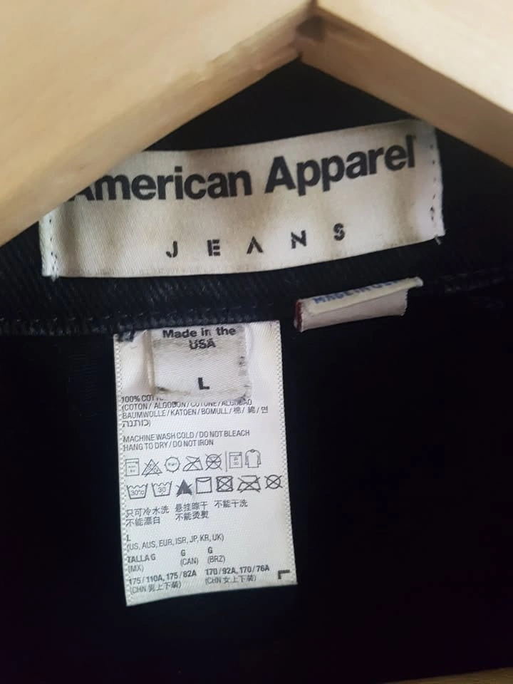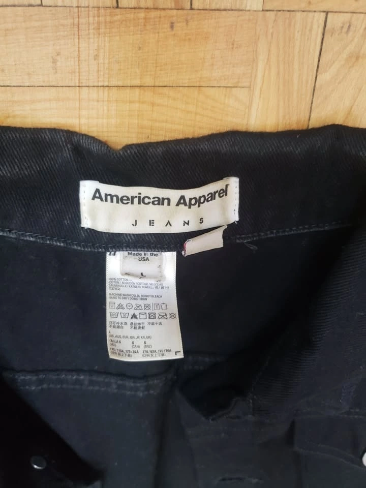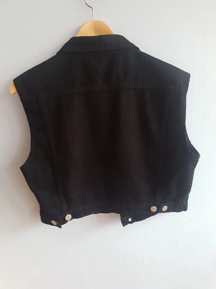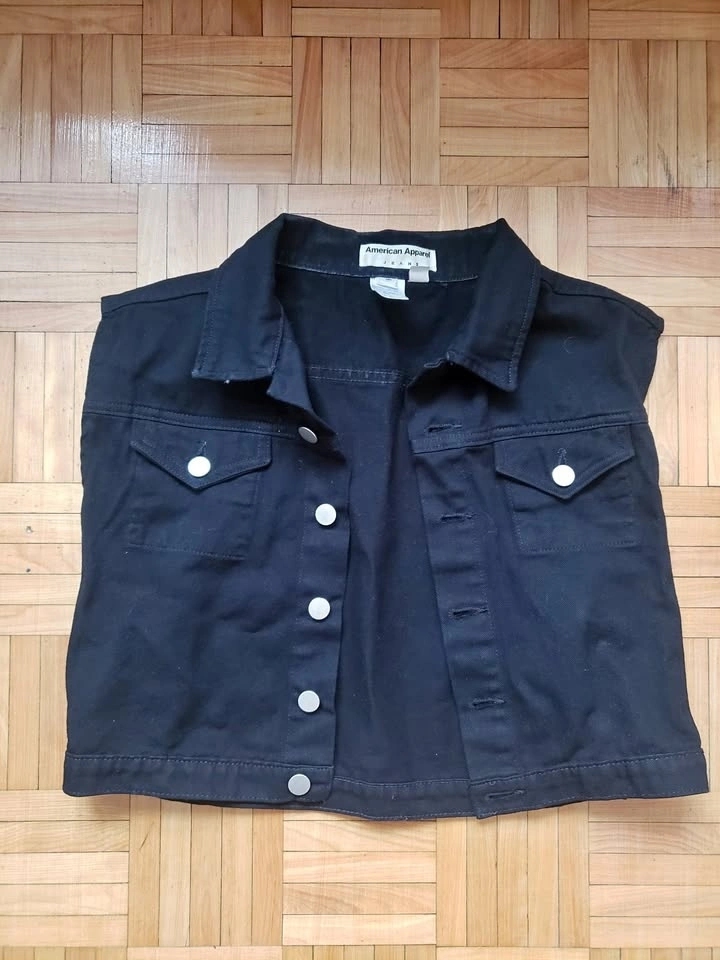 American Apparel black denim vest, size L. Features 5 silver button closure and two breast pockets with button closure. Worn a couple times, like new with no damage. Measurements: 16" Long, 19" Wide. Pick up near Queen and John.
