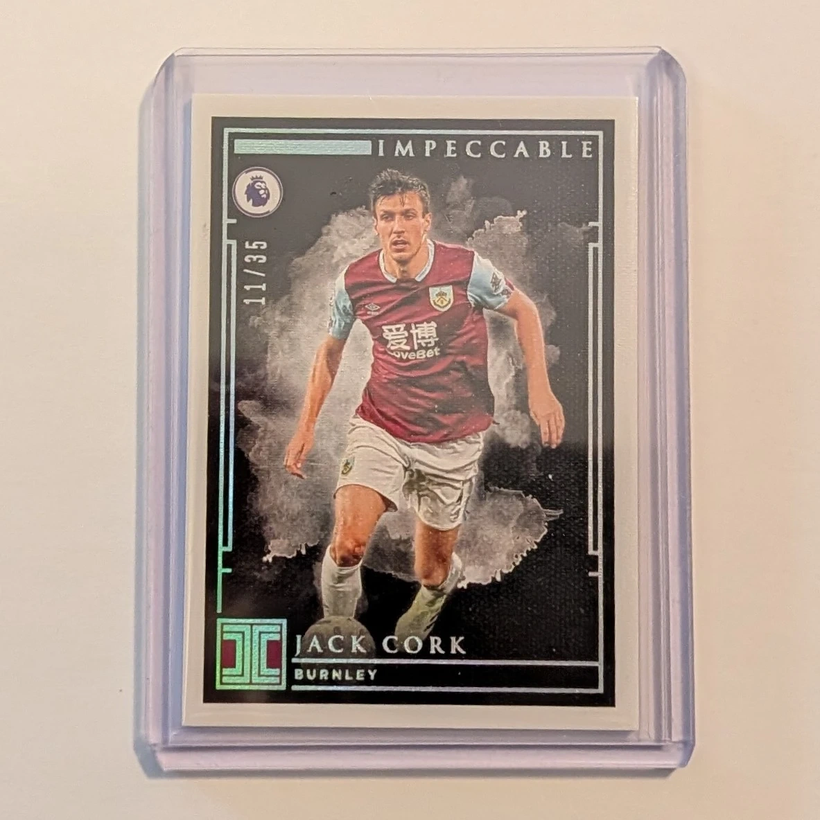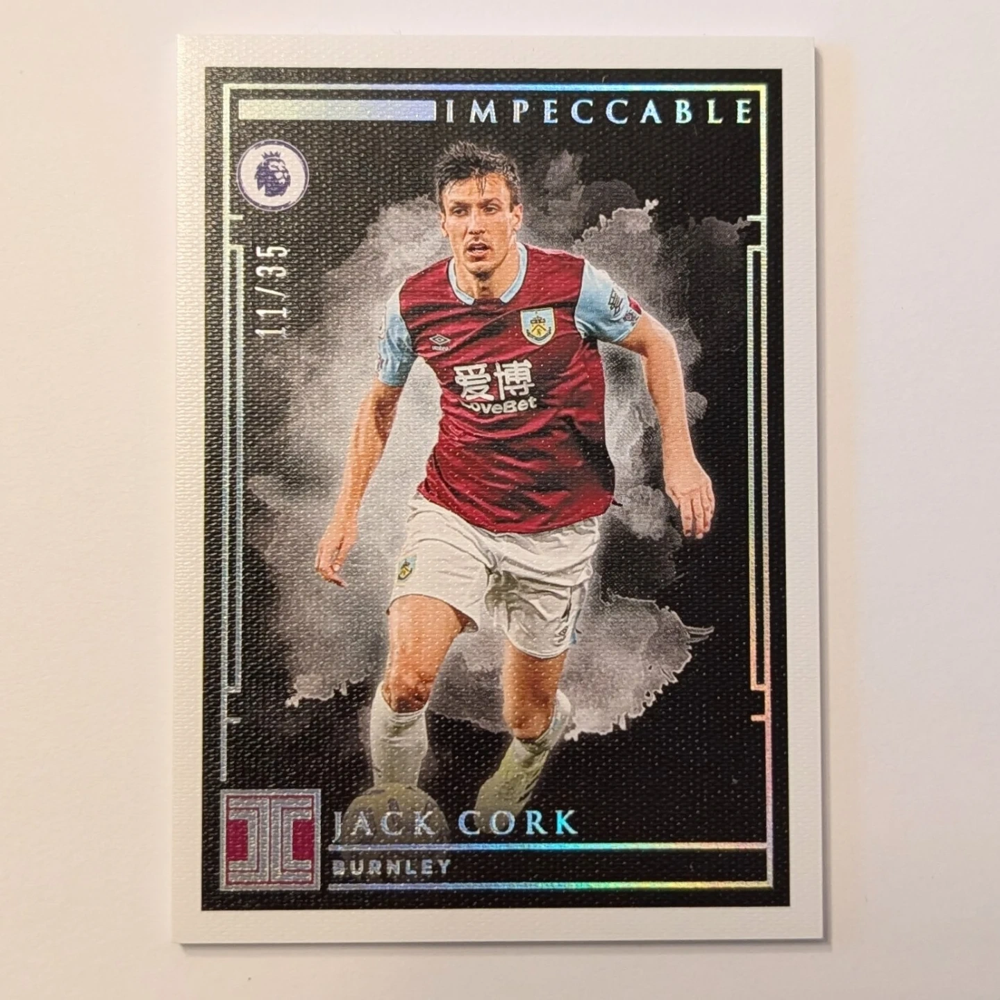 This is a stunning Silver parallel from the inaugural release of Panini Impeccable Premier League. Impeccable is known for its high-end production, featuring thick card stock and a premium matte finish with silver foil accents. Limited to only 35 copies worldwide, this card is a must-have for Burnley team collectors or Jack Cork completionists.