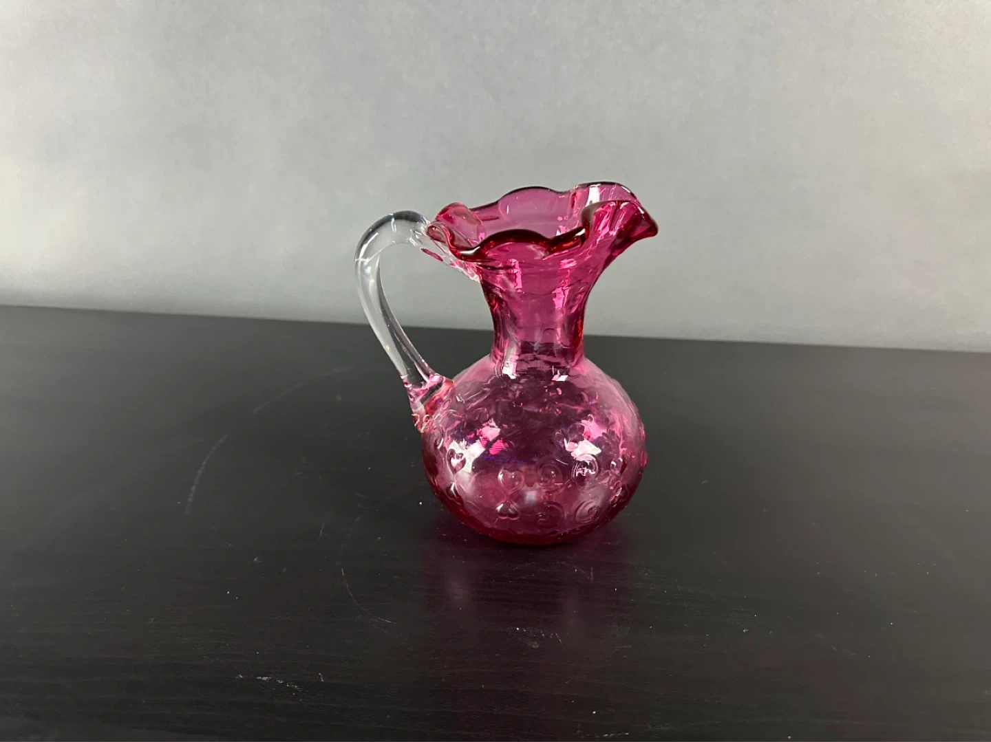 This is a charming pink glass pitcher. It's small and features a clear glass handle. The glass has a textured, bubbled design all over. Perfect for a small floral arrangement or as a decorative accent piece!