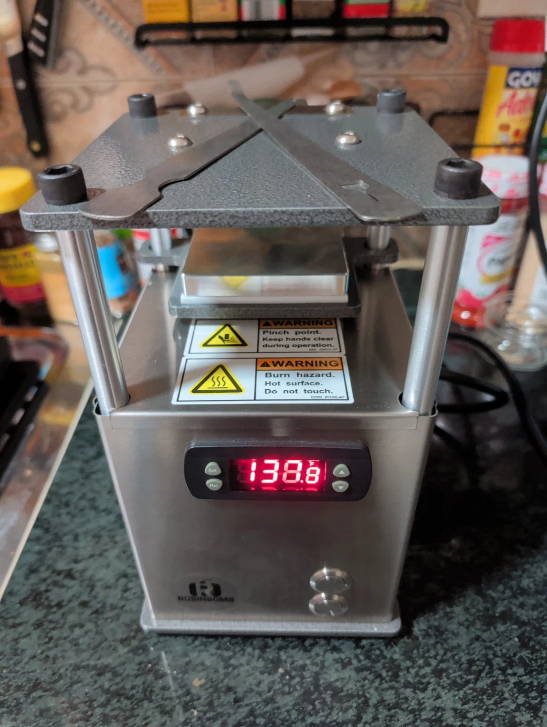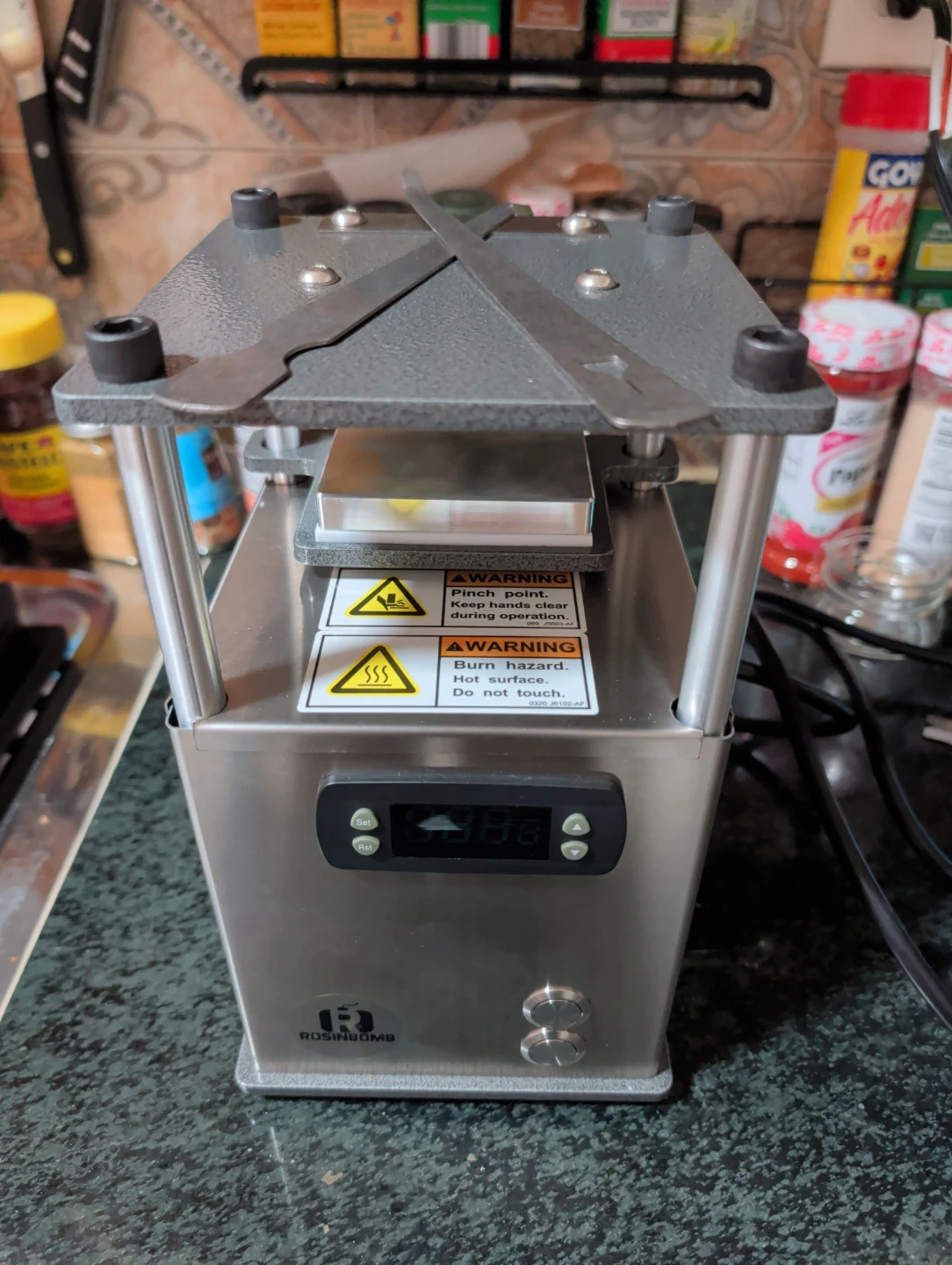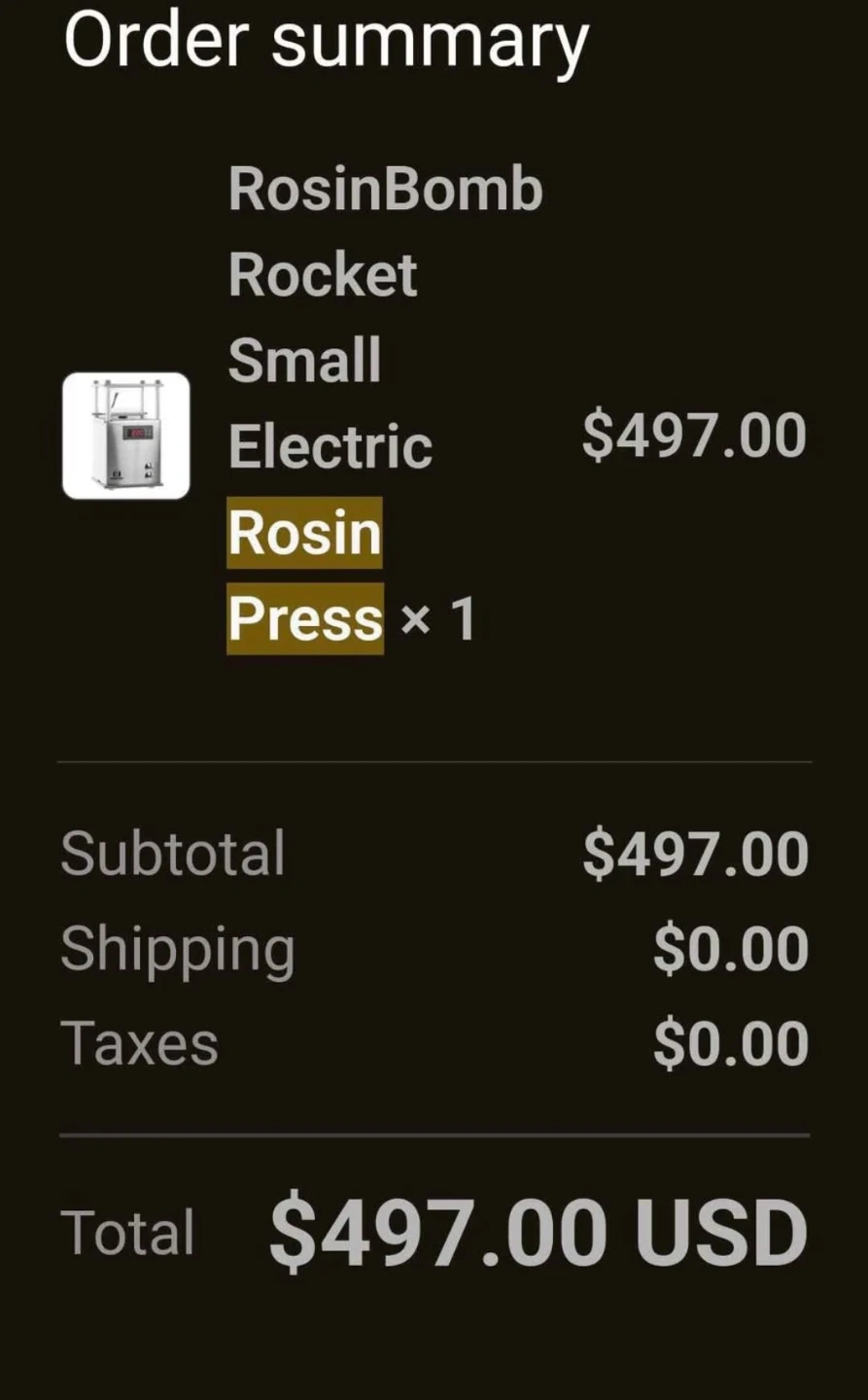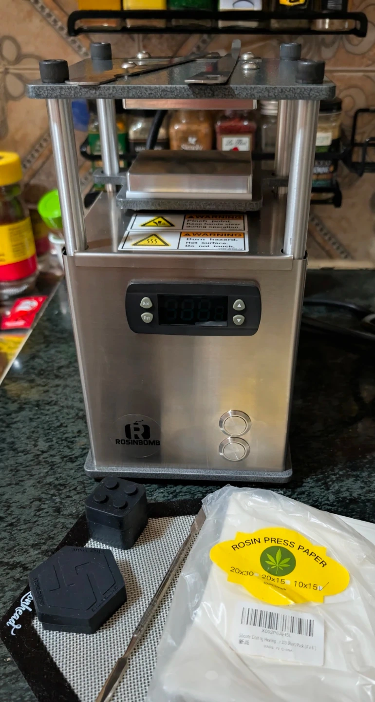 This is the RosinBomb Rocket. It's a small electric rosin press. Features a digital temperature display. New, fully functional, never used. Comes with accessories.