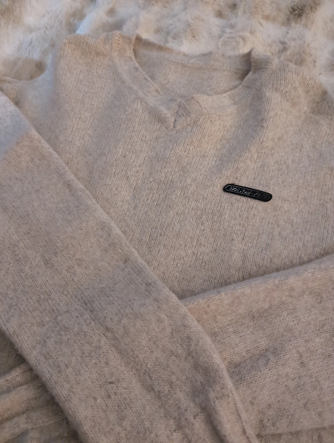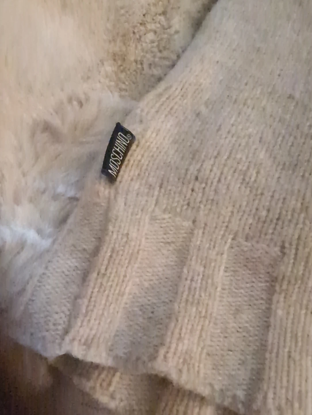 A lovely Moschino V-neck sweater in a light beige colour. It's made from a soft knit material. This sweater is a great layering piece for cooler weather!