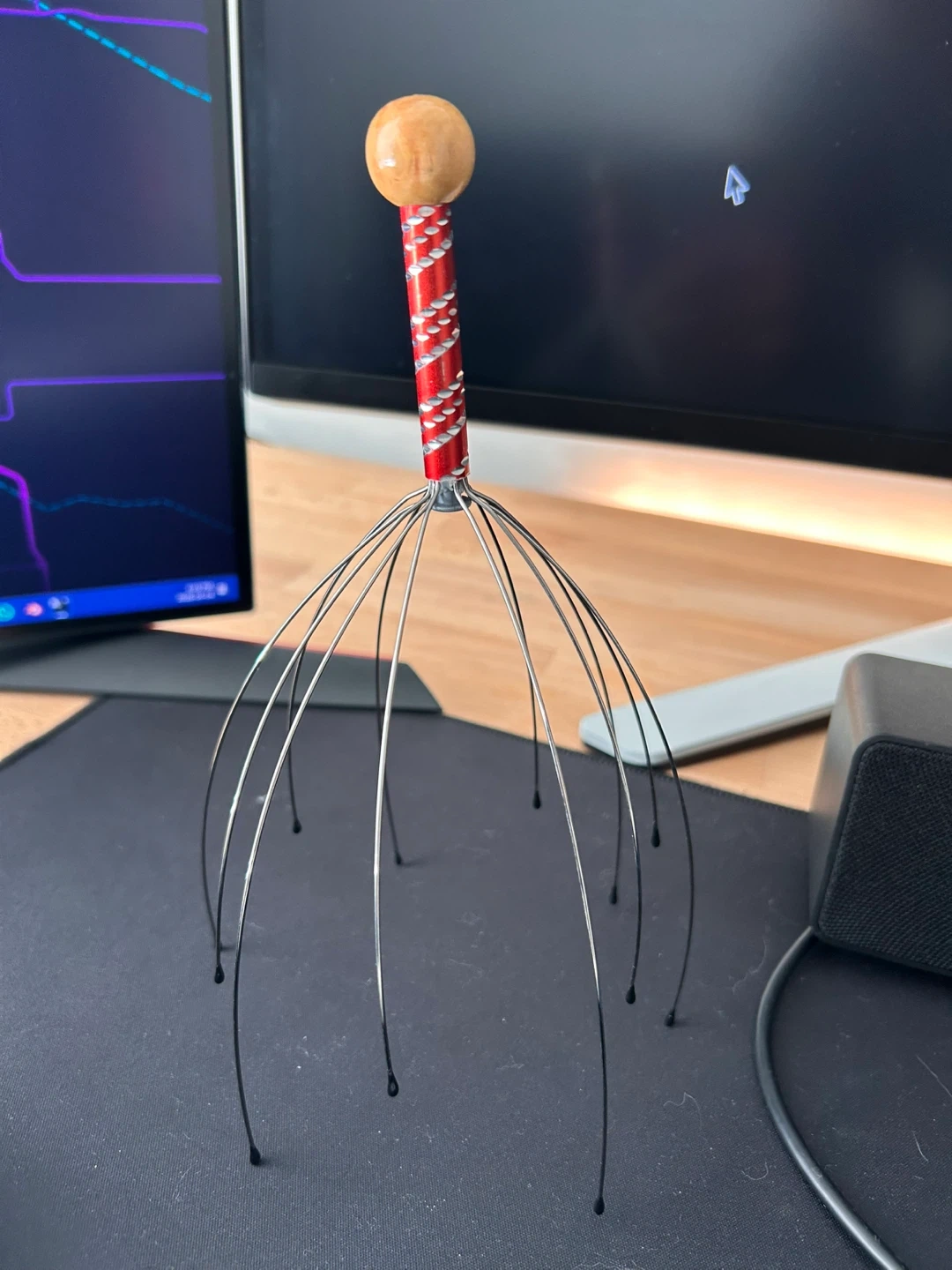 It features flexible metal "fingers" with soft rubber tips that gently glide over your head to relieve tension and improve circulation