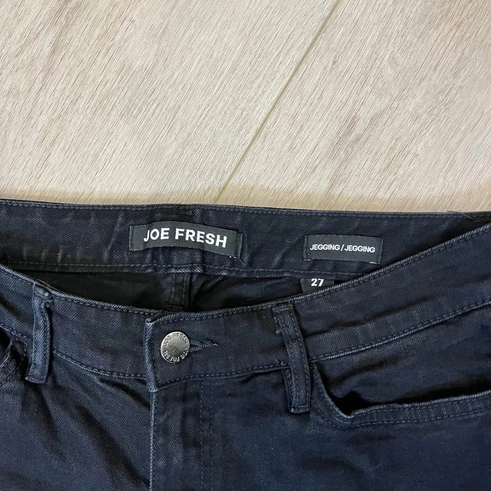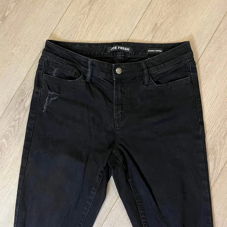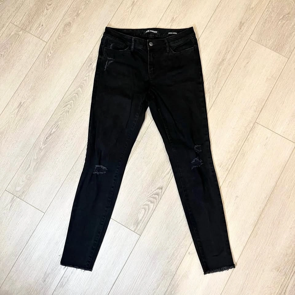 JOE FRESH distressed black women’s skinny jeans. Zipper + button closure.