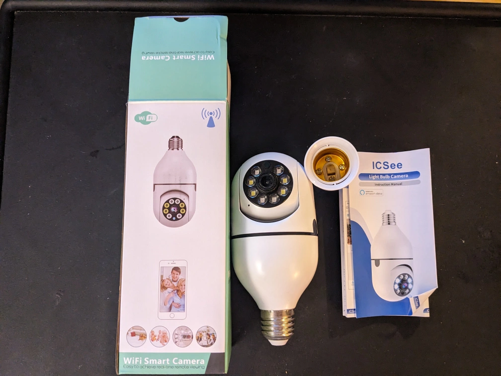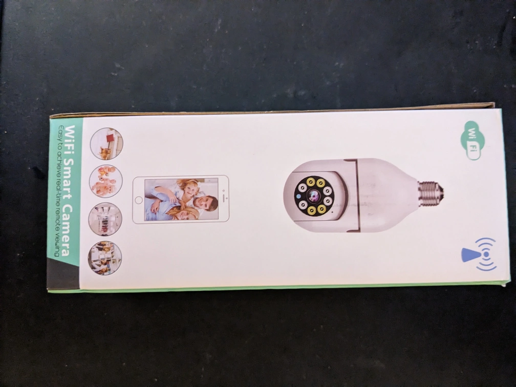 Light bulb camera with instructions. The camera allows you to watch live video and take photos remotely. It's easy to set up and use. The camera can be used indoors or outdoors and is perfect for security or monitoring purposes. Comes with MicroSD card for memory and extra plug adapter.