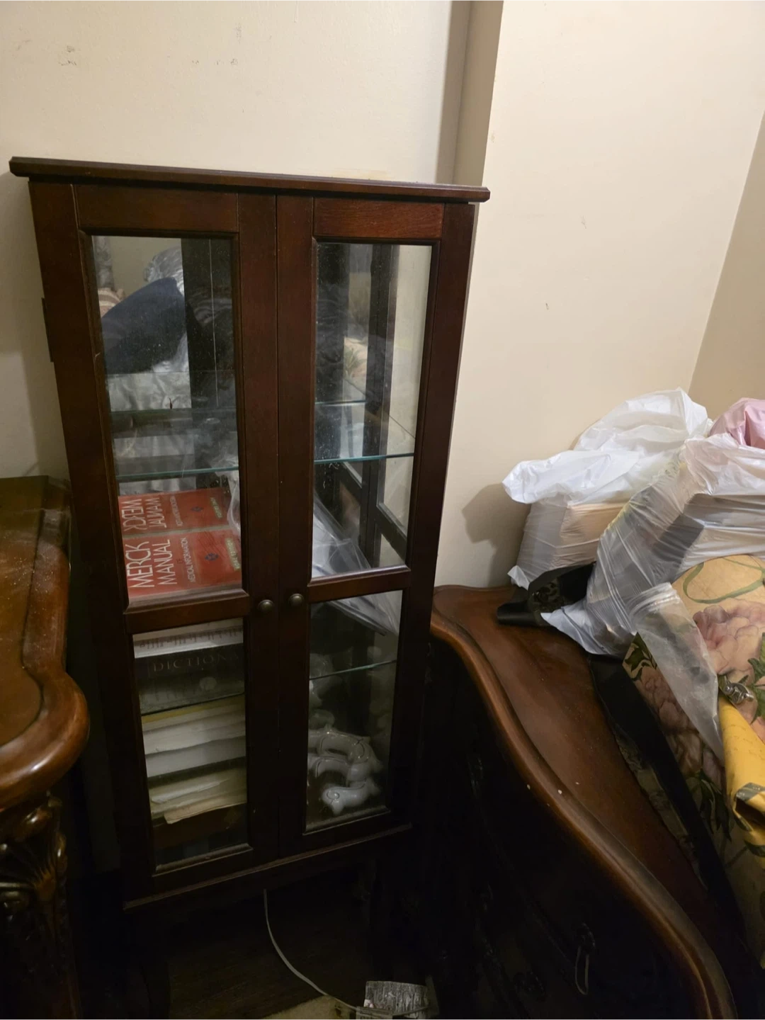 This wooden display cabinet features glass doors for showcasing items. It has adjustable glass shelves inside. It's a great piece for storing and displaying collectibles or books.