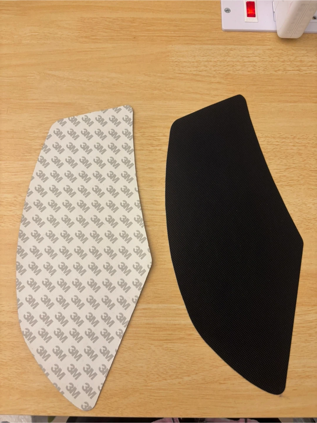 Two-piece motorcycle tank pad with 3M adhesive backing. Black textured grip surface provides enhanced control. Protects your tank from scratches.