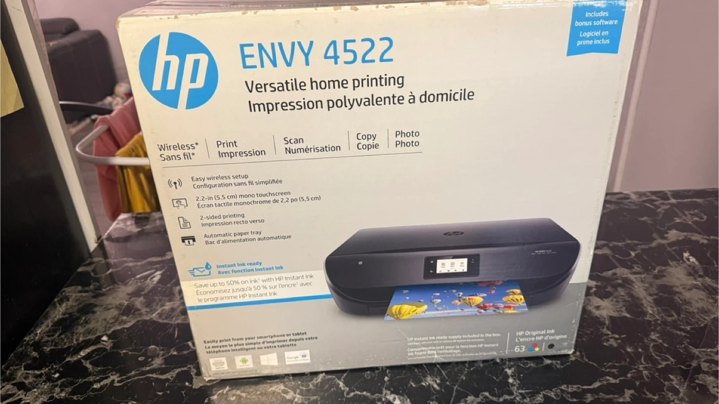 This is an HP ENVY 4522 versatile home printer. It features wireless printing, 2.2-inch touchscreen, and automatic paper tray. It's Instant Ink ready, offering up to 50% savings on ink.