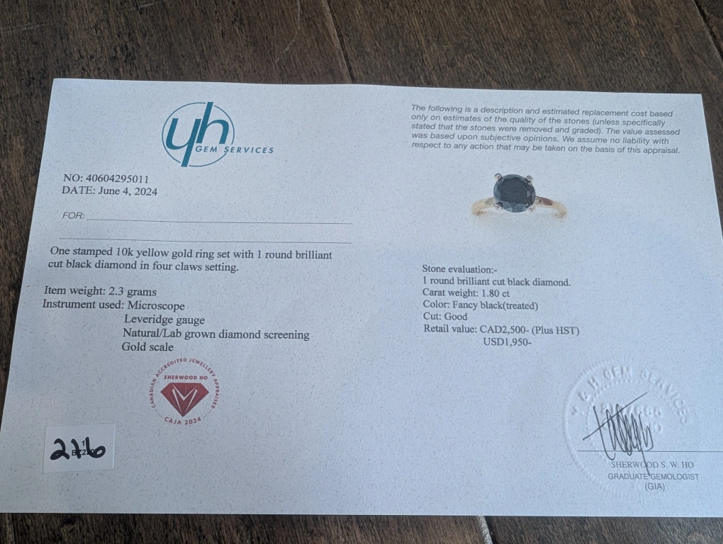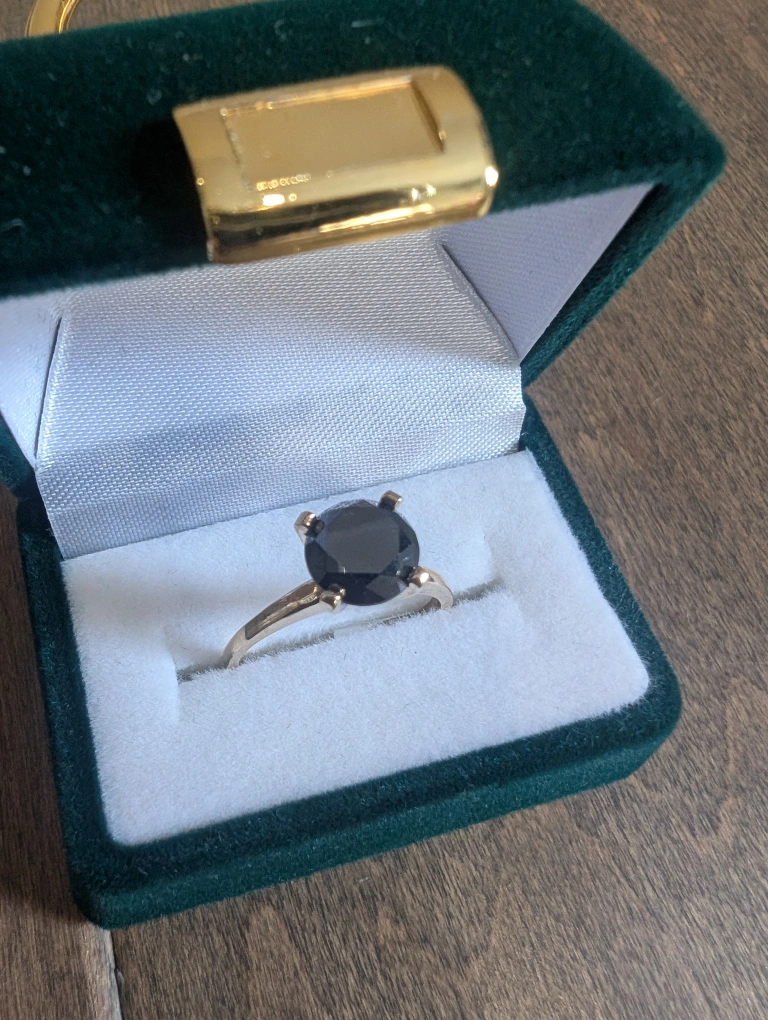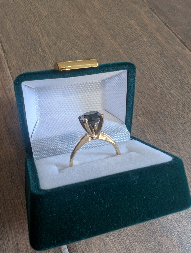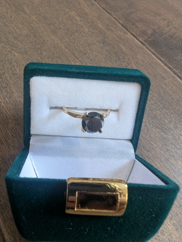 Brand new 10kt yellow gold black diamond ring for sale. One round brilliant cut black treated diamond, 1.80ct carats. Ring size 6, made in Canada. Retail value $2500, selling for $650 FIRM. Comes with appraisal.