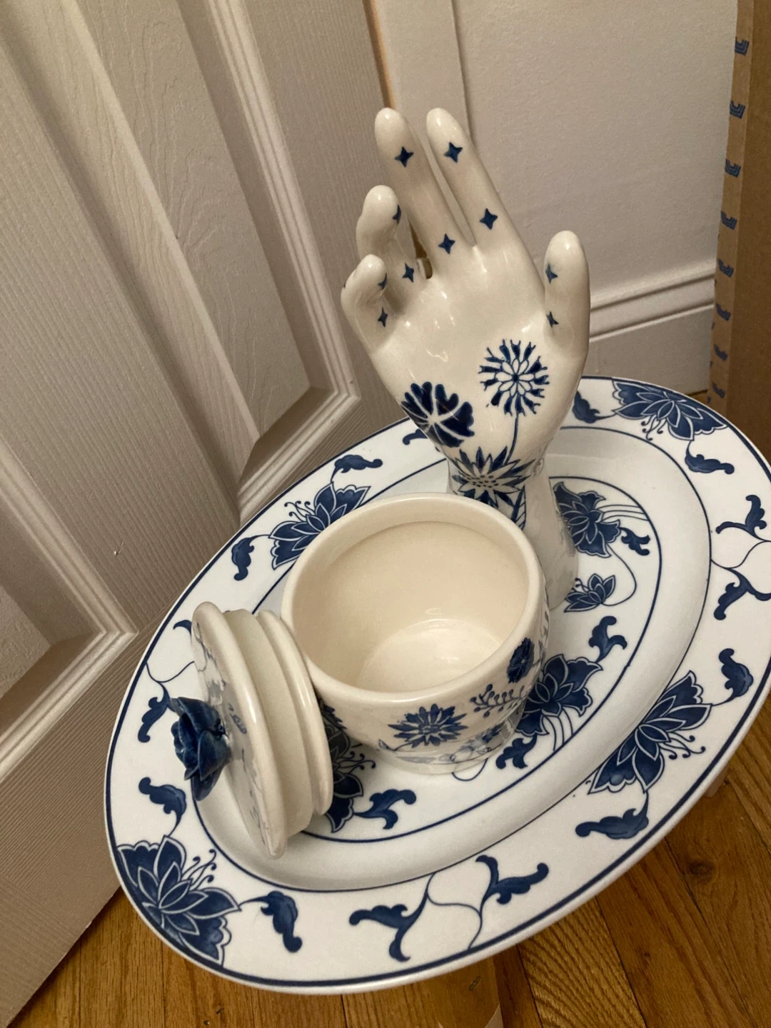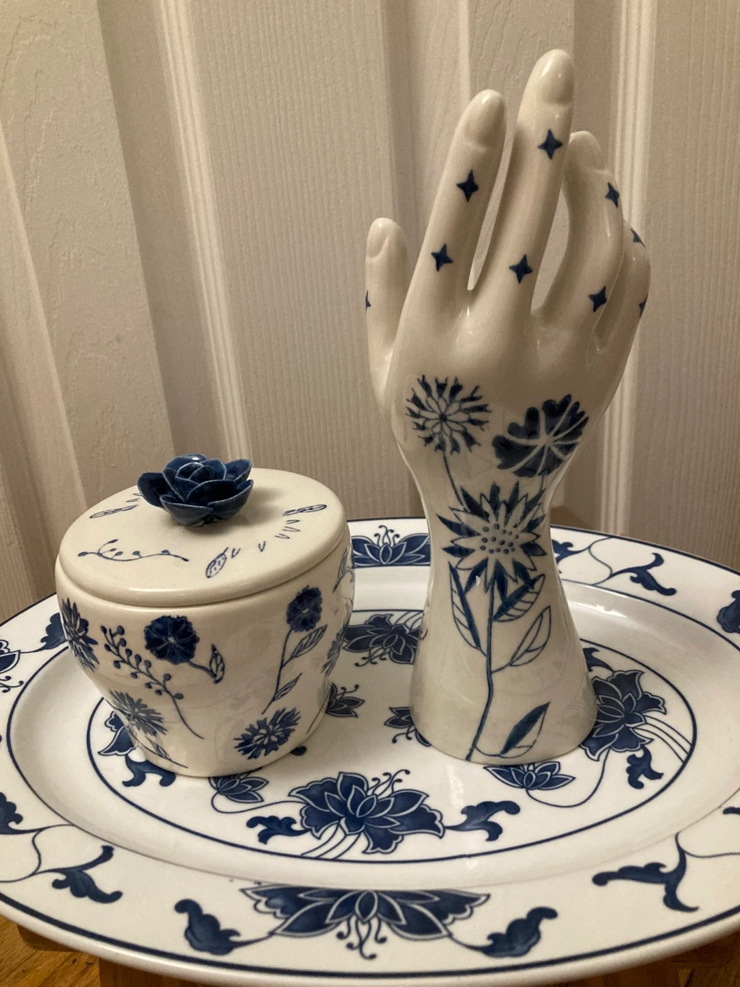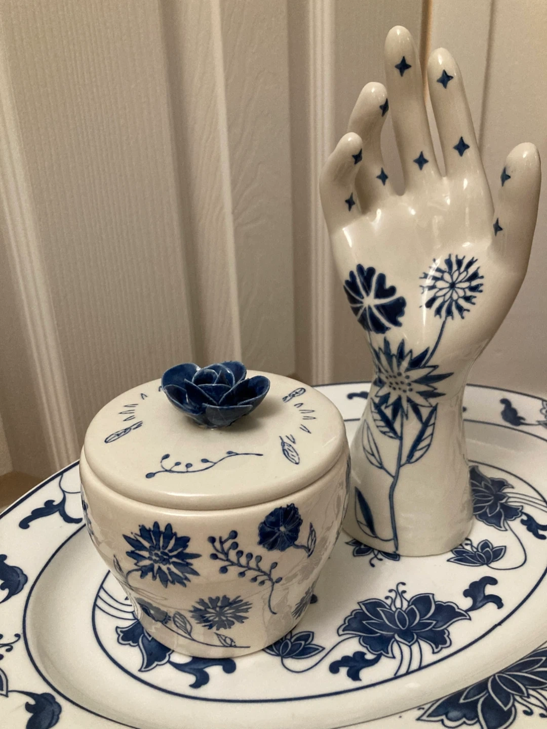 Pick up and cash only. Decorative ceramic set featuring a hand-shaped ring holder and a lidded trinket dish. Both pieces showcase a blue floral pattern on white ceramic. With holding ceramic tray.They're great for organizing small jewelry or decorative items!