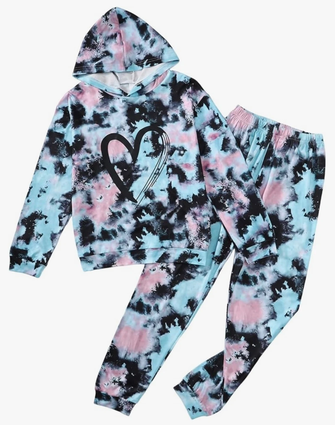 This tie-dye set features a hoodie and matching pants with a heart graphic. It's made from a soft, comfortable material. Perfect for lounging or casual wear!