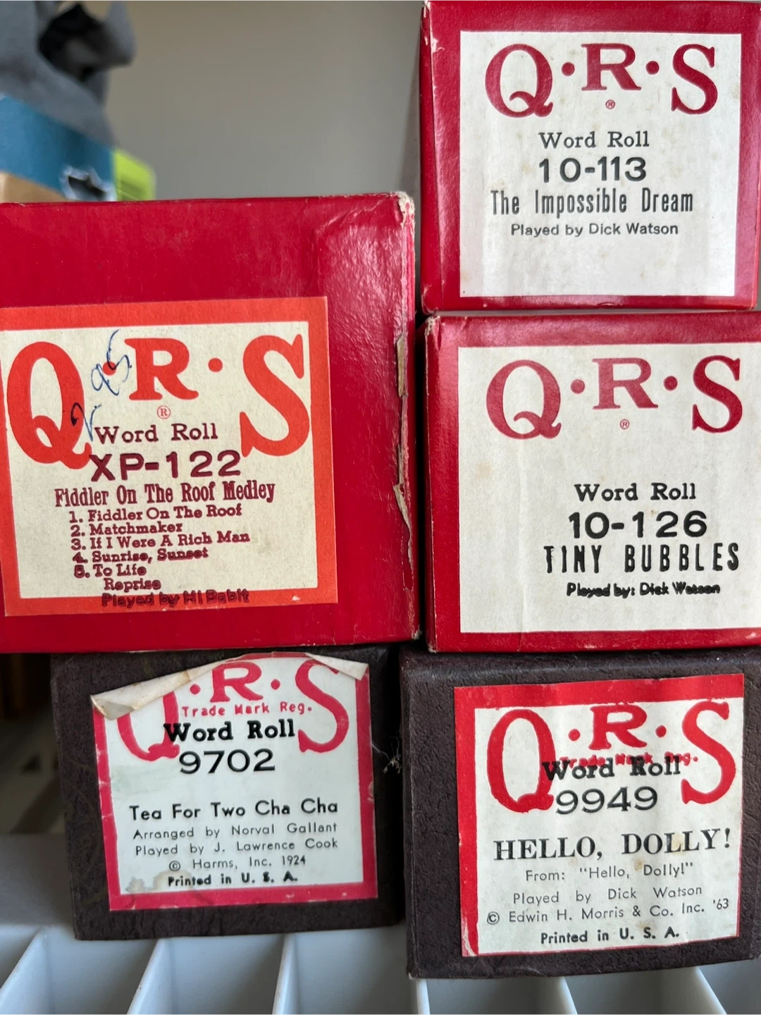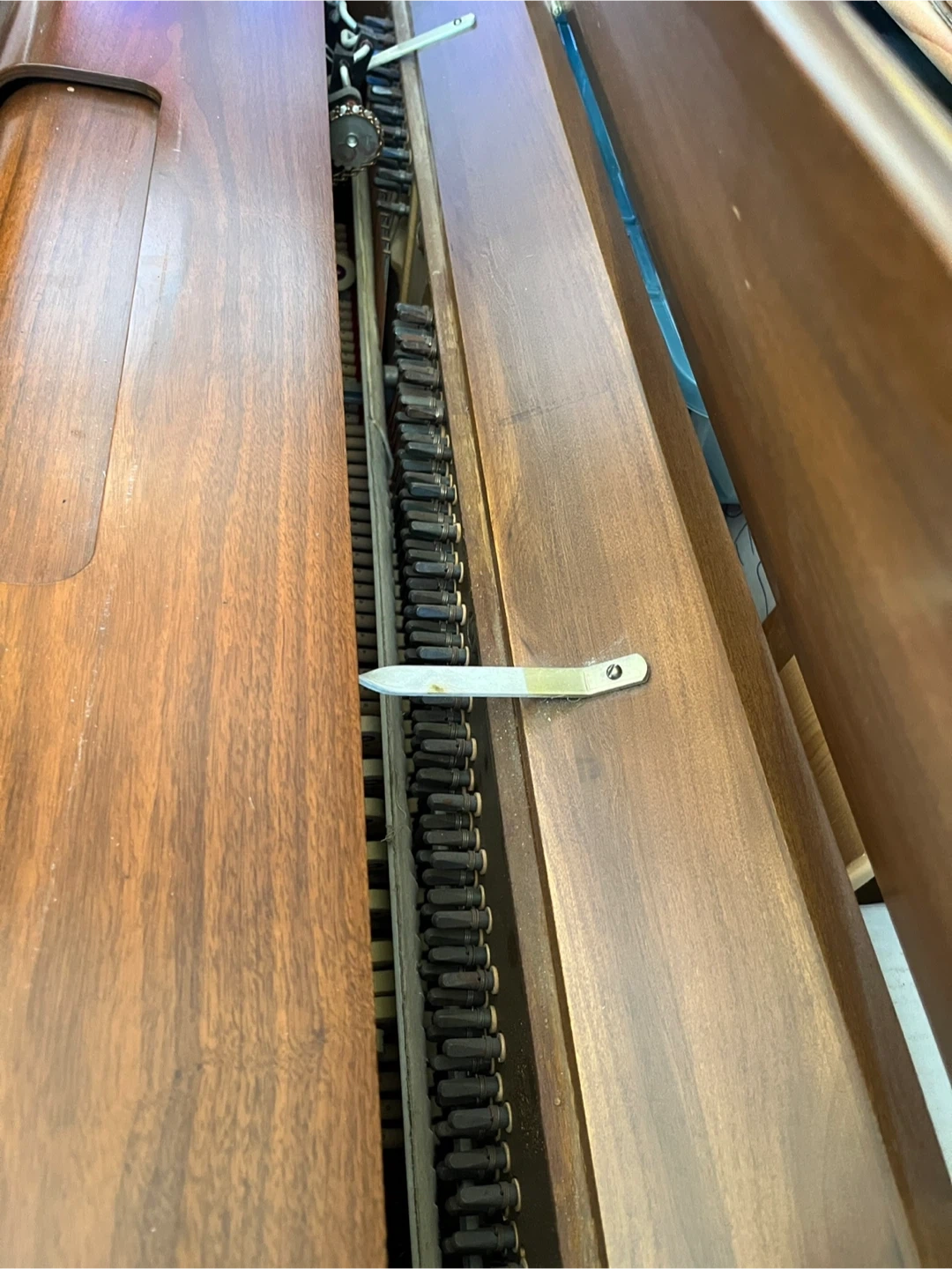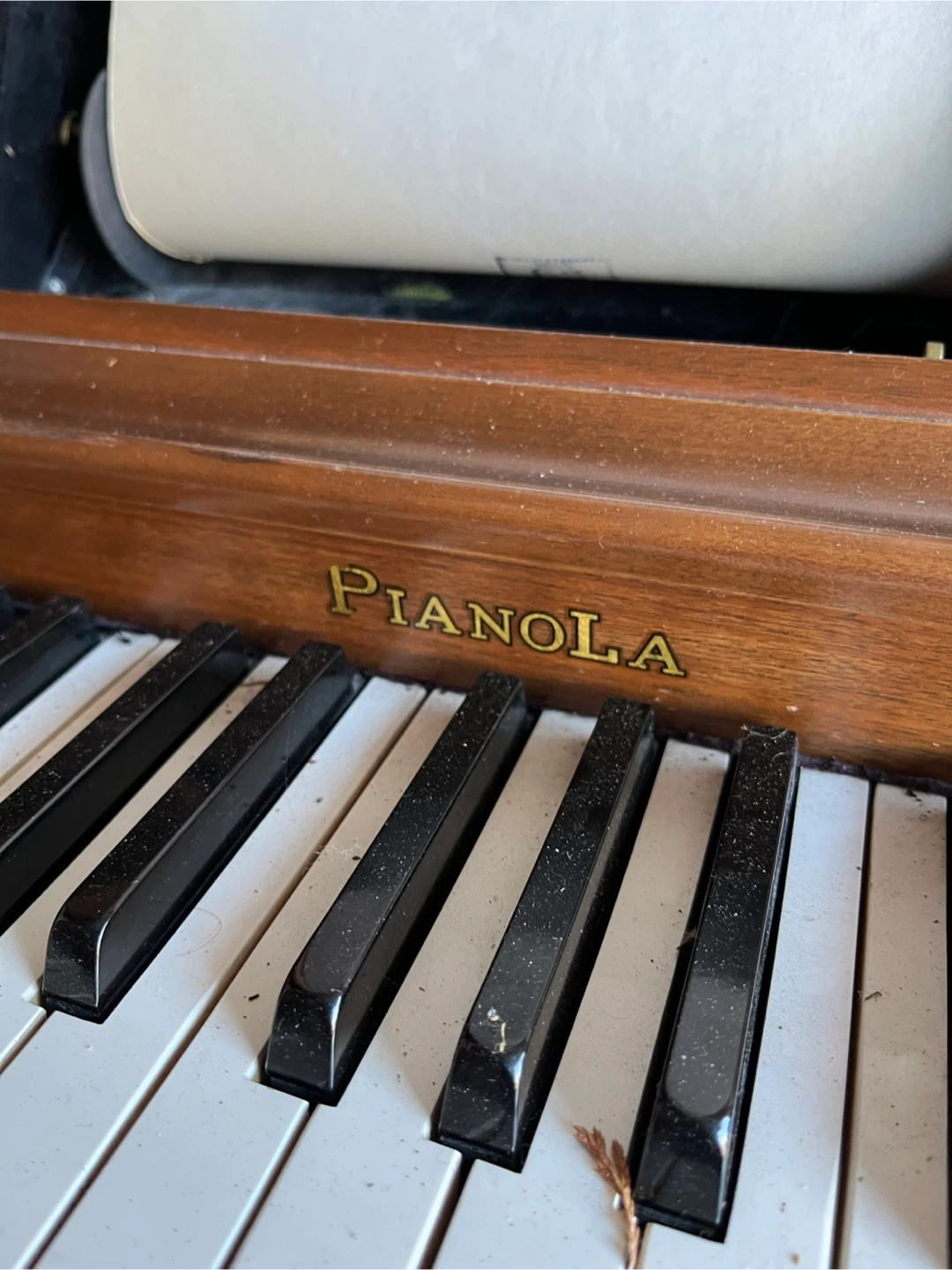 Vintage Pianola player piano with wooden casing. It features a roll mechanism for music playback. This instrument is for enthusiasts and collectors.