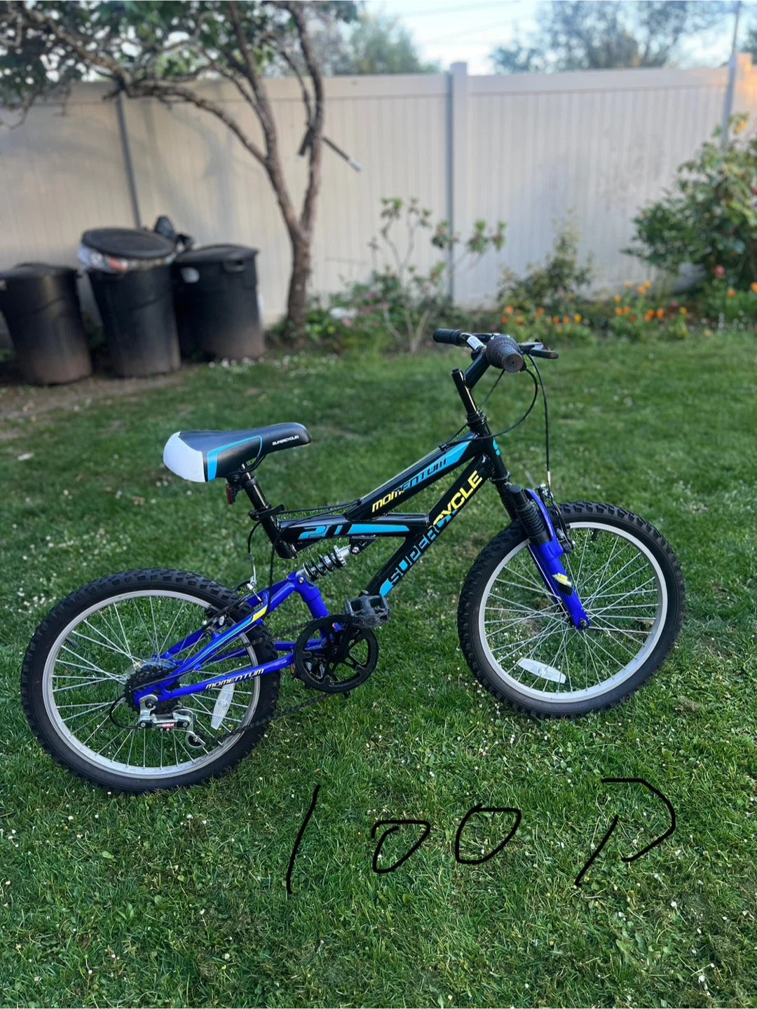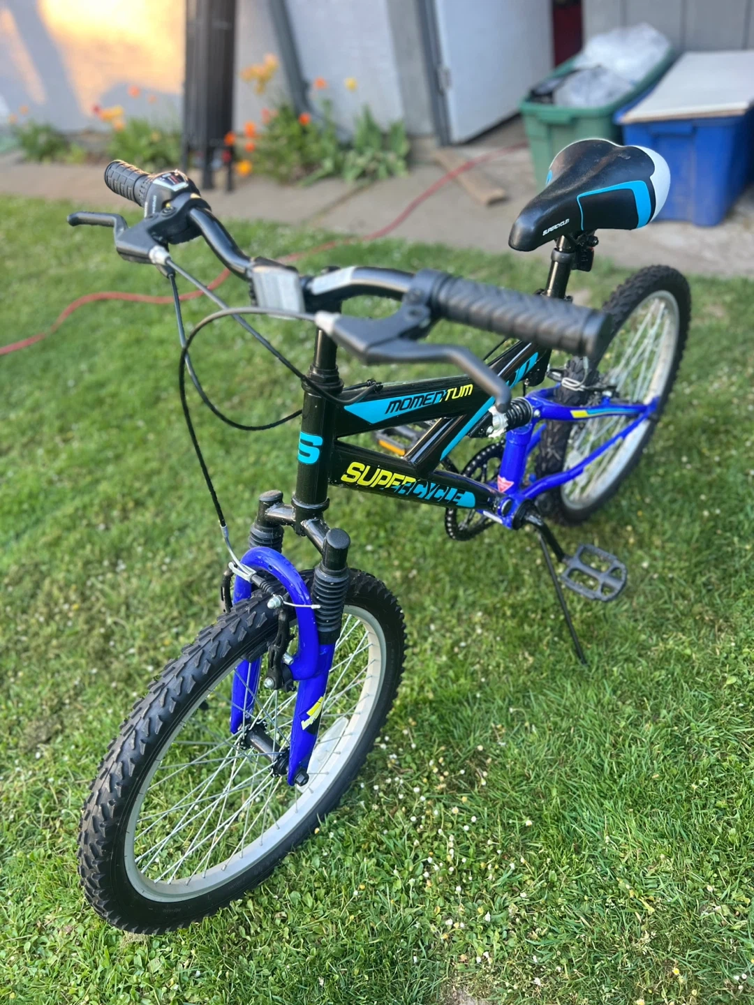 This is a kids' Momentum Supercycle bike, black and blue. It has front and rear suspension for a smoother ride. The tires are 20 inches.