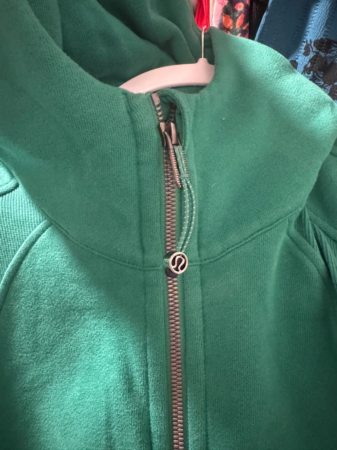 A Lululemon zip-up hoodie in a vibrant green colour. It features a full zipper and front pockets. This hoodie is perfect for layering during cooler weather.