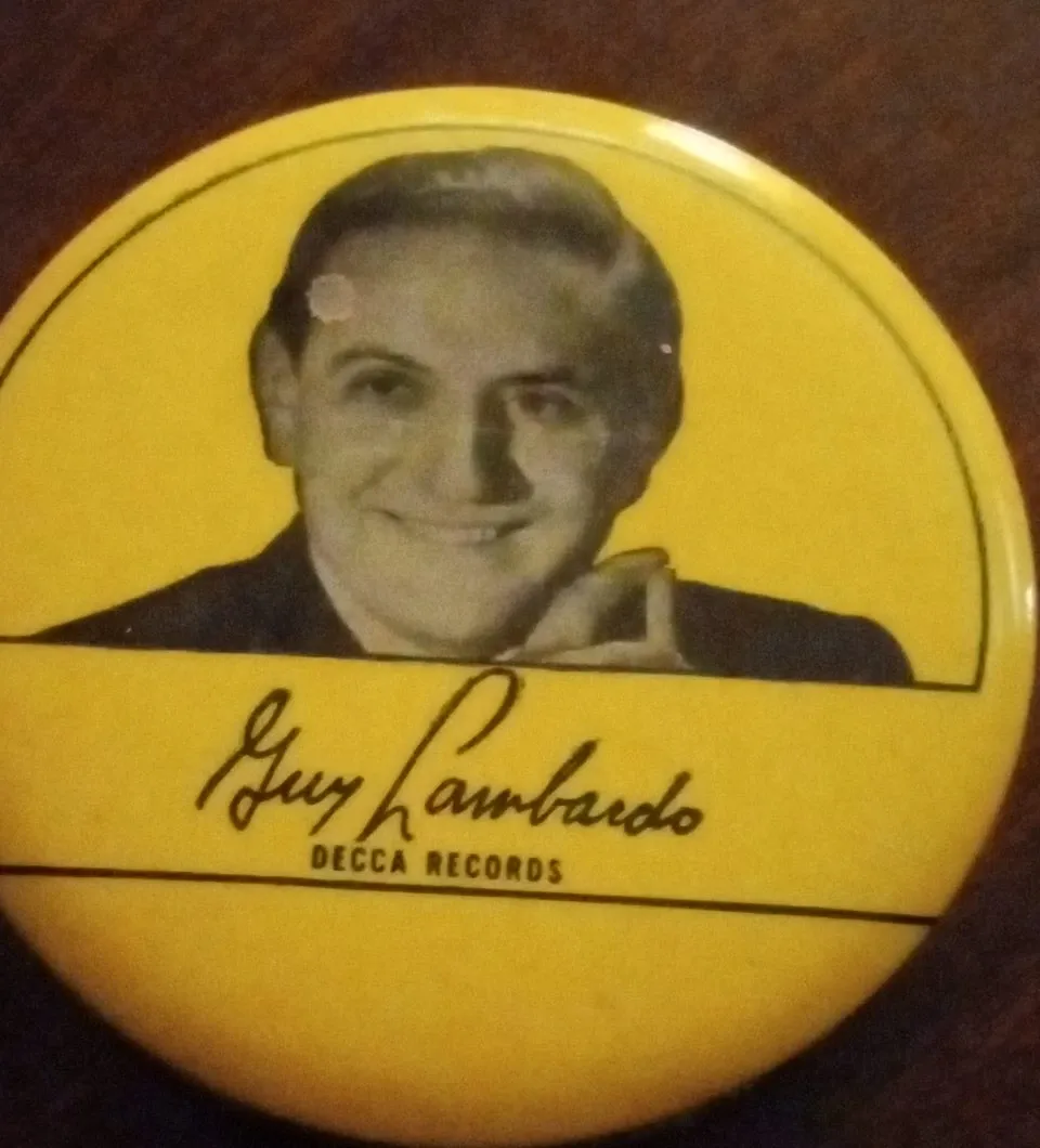 This is a Guy Lombardo pin from Decca Records. It's yellow with a black and white image of Guy Lombardo and his signature. Great for collectors!
