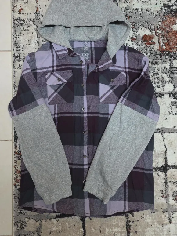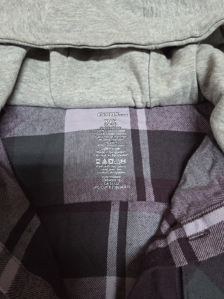 This George brand shirt is a size XL(14/16) with a plaid flannel body and grey cotton sleeves and hood. It's made of 100% polyester for the flannel and 90% cotton/10% polyester for the sleeves and hood. Wash with like colours for best results.