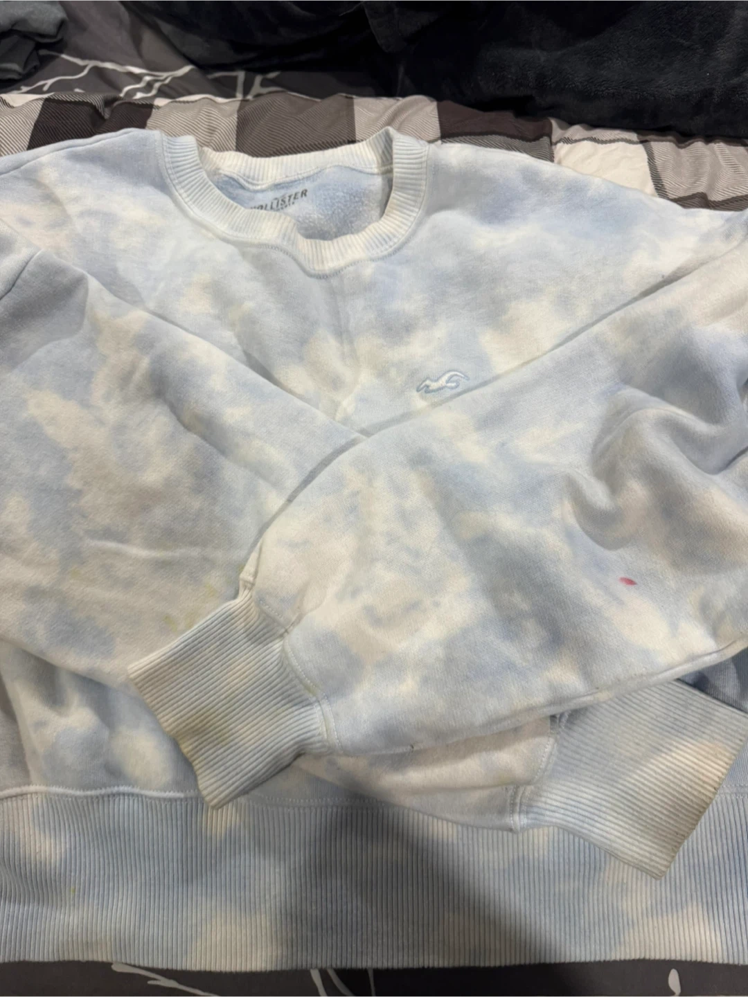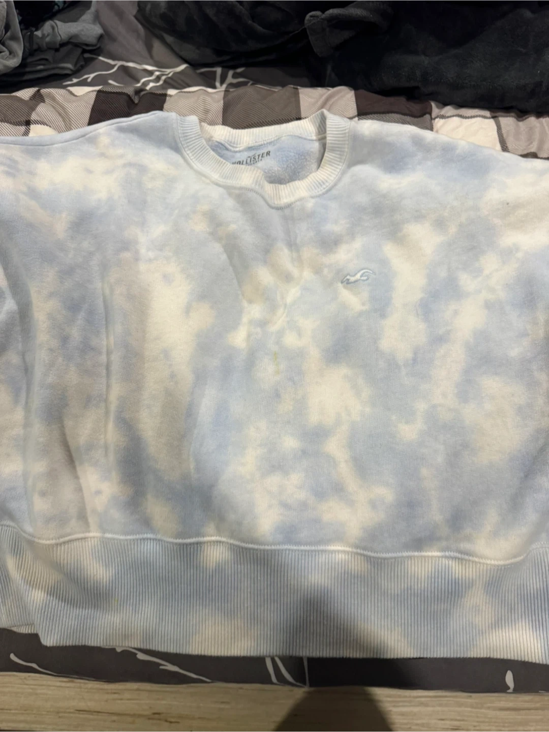 This is a Hollister sweatshirt with a tie-dye pattern. It's a size small and made in Vietnam. It features a crew neck and long sleeves.