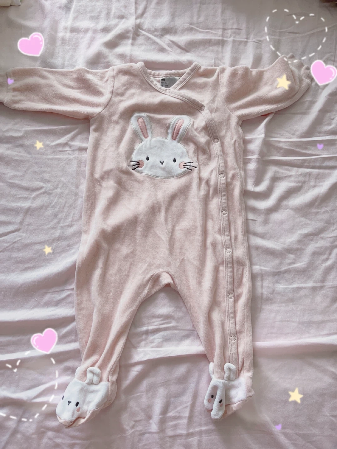 A super cute baby pink onesie from H&M! It features an adorable bunny design on the front and little bunny details on the feet. Perfect for keeping your little one cozy and looking sweet