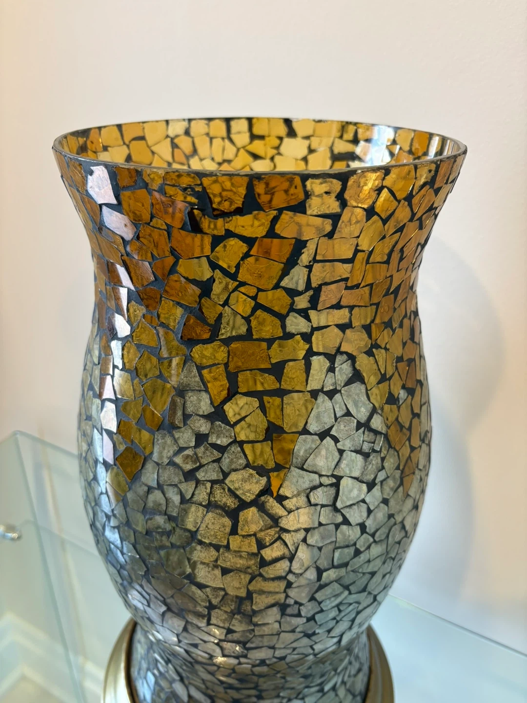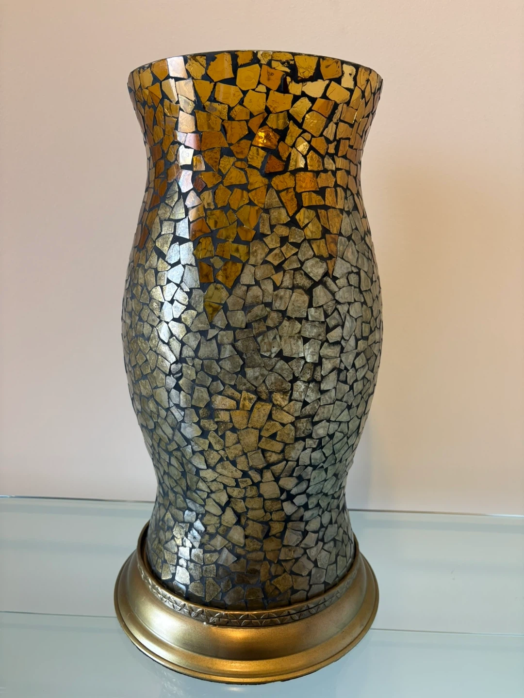 Beautiful mosaic glass candle holder with a unique design! The vase features a stunning mosaic pattern in shades of gold, silver, and black. It would make a lovely addition to any room in your home