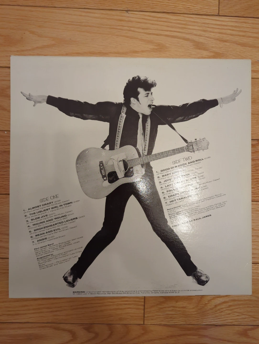 Paul James Band's "Almost Crazy" vinyl record. Features tracks like "Almost Crazy" and "The Ugliest Jive in Town."