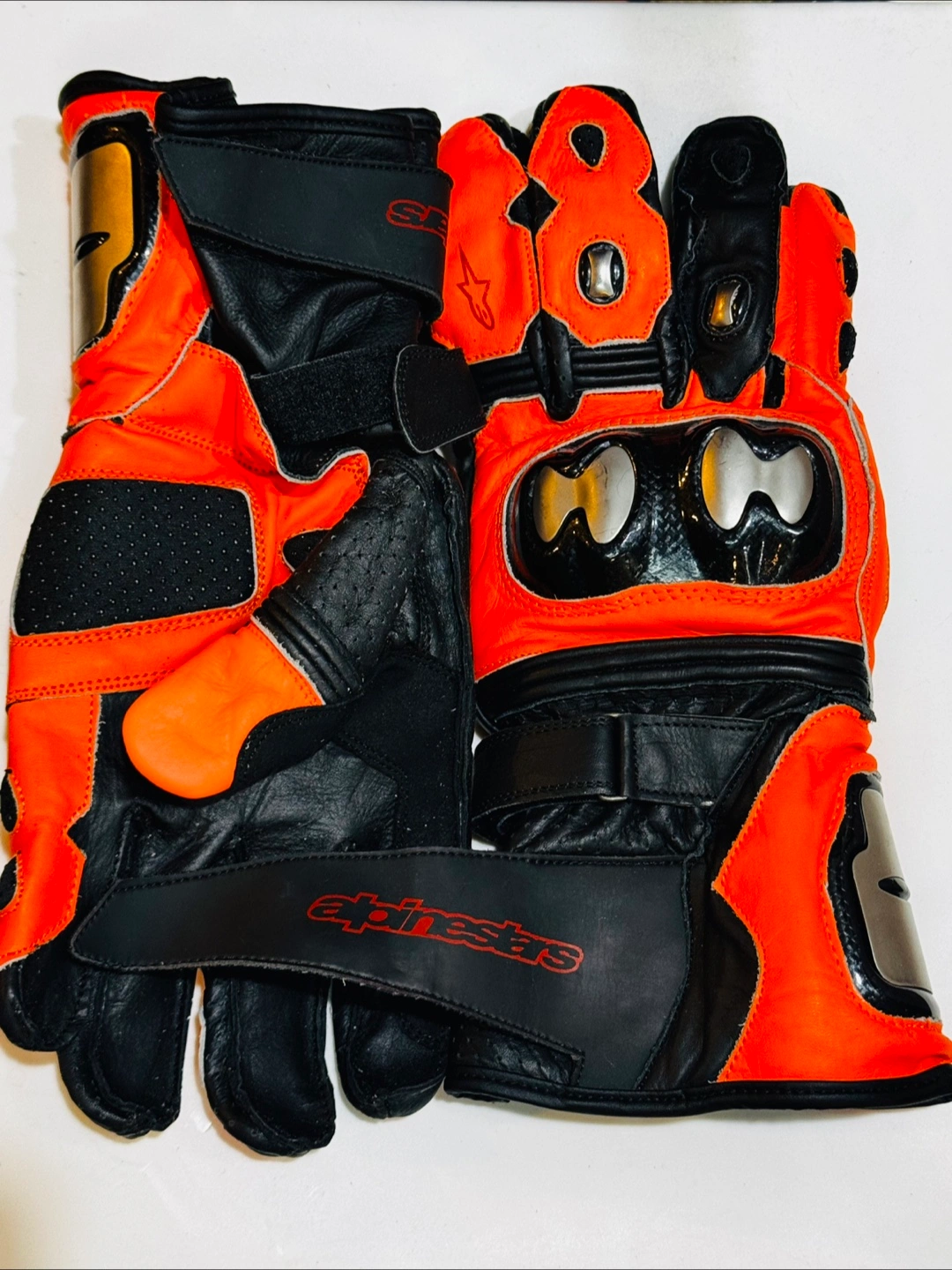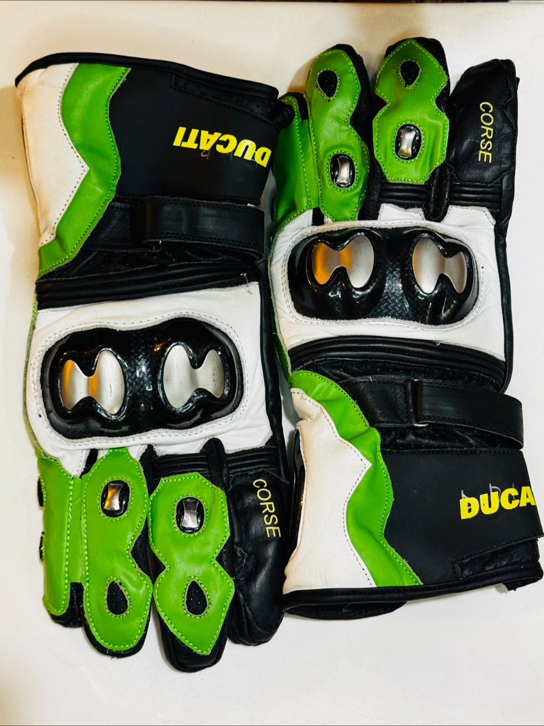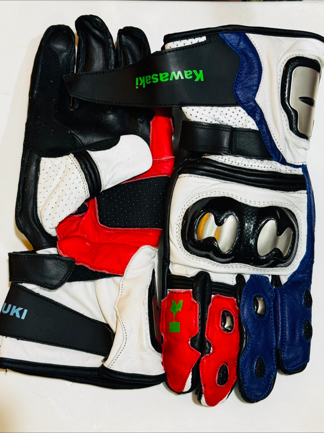 Motorcycle gloves in various colours and designs. Some have knuckle protection and wrist straps. You can use these to feel more secure while on the road.